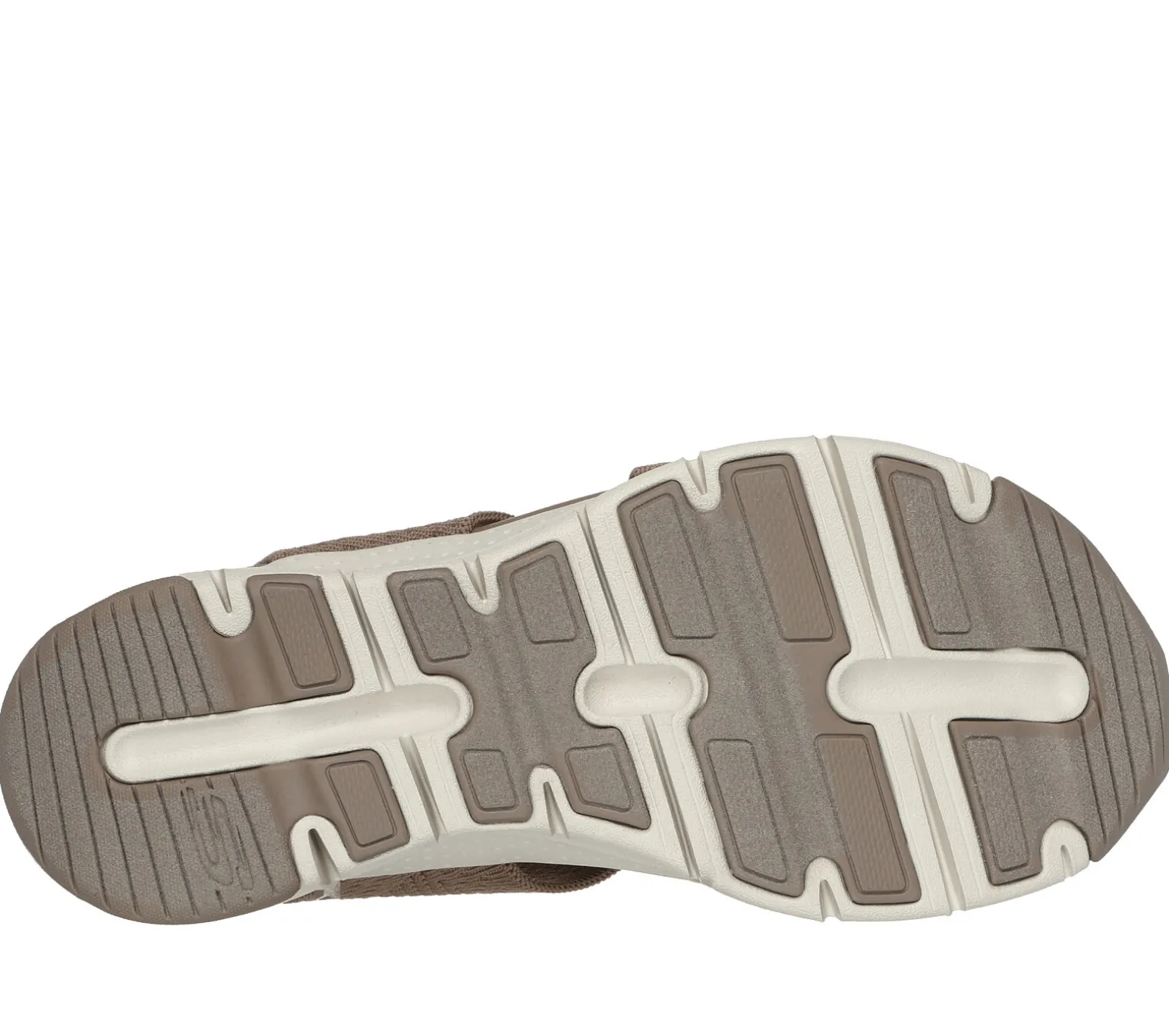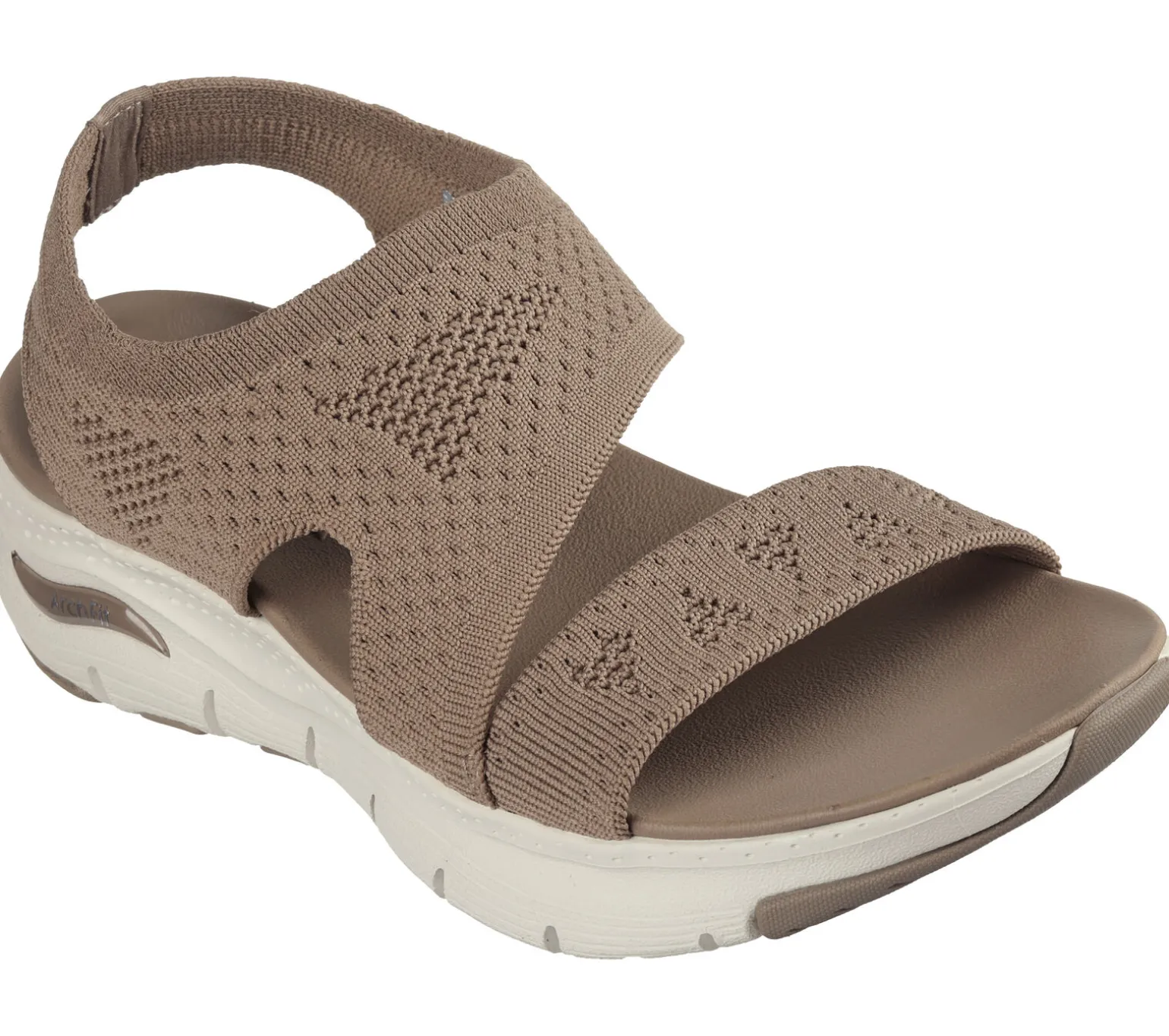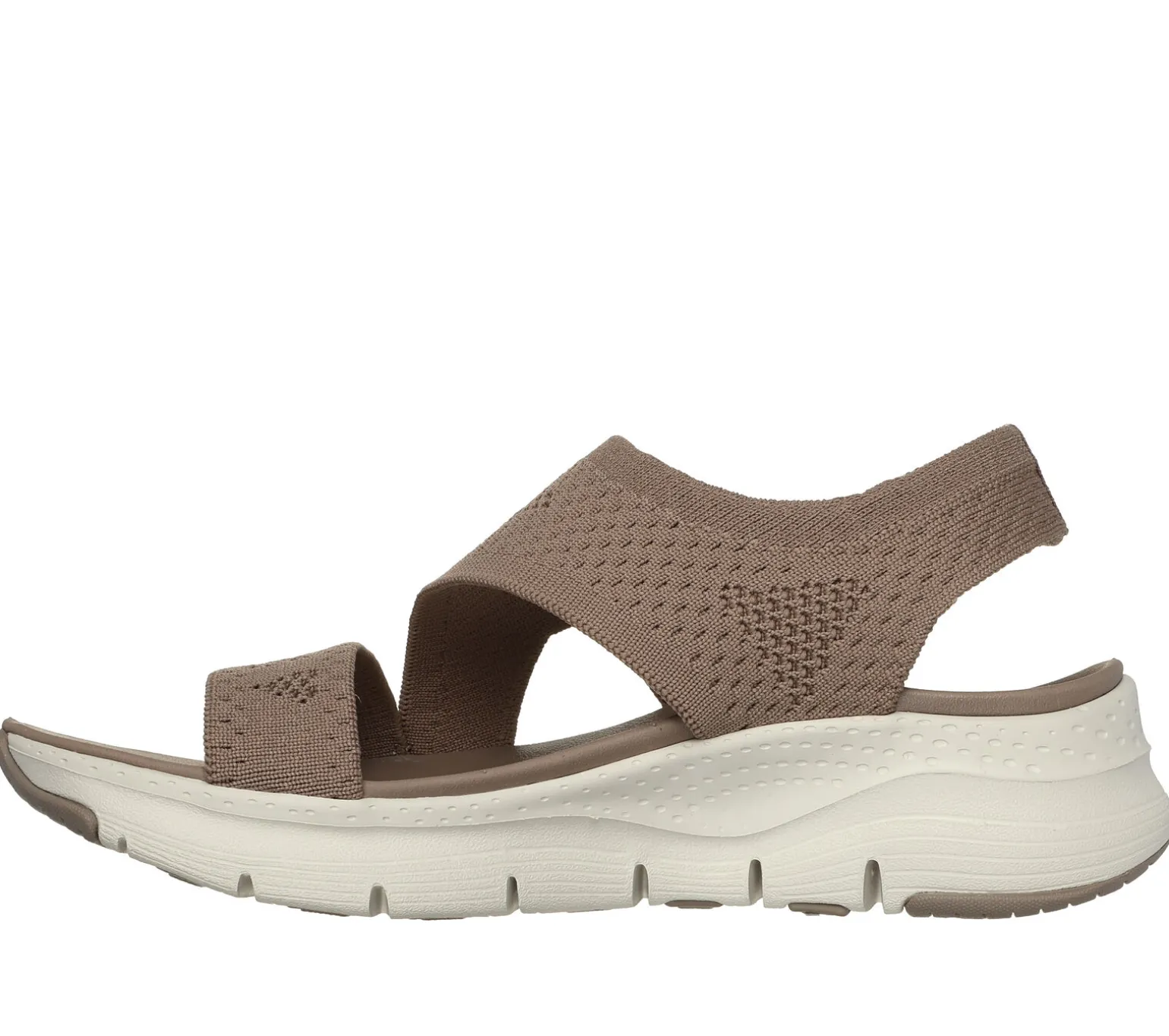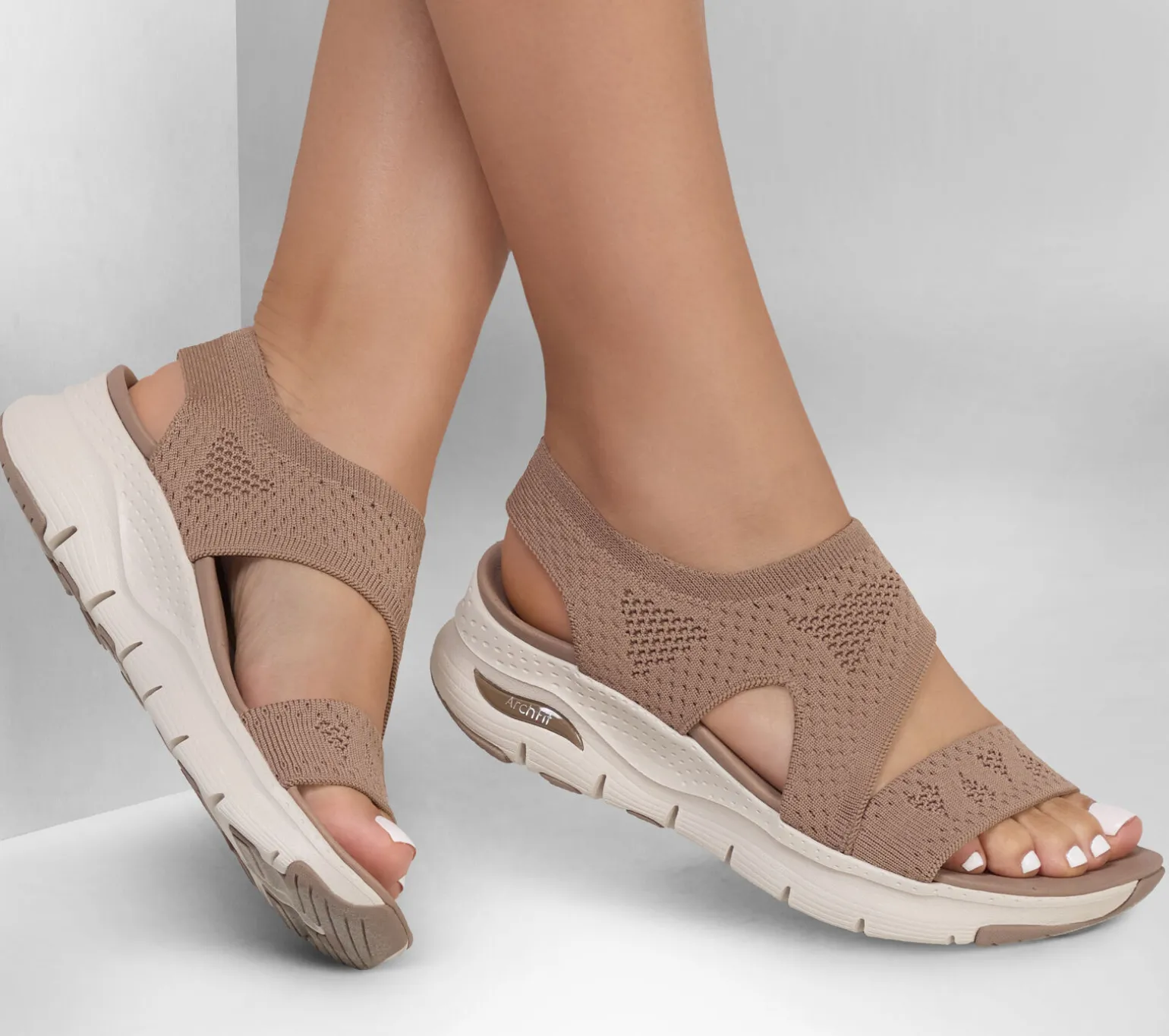 Die Skechers Arch Fit – Brightest Day Sandale vereint ganztägig stützenden Tragekomfort mit einem luftigen Design. Diese Sandale zum Hineinschlüpfen ist mit einem atmungsaktiven Stretch Fit-Obermaterial aus Funktionsstrick und einem gepolsterten Arch Fit® Fußbett ausgestattet.