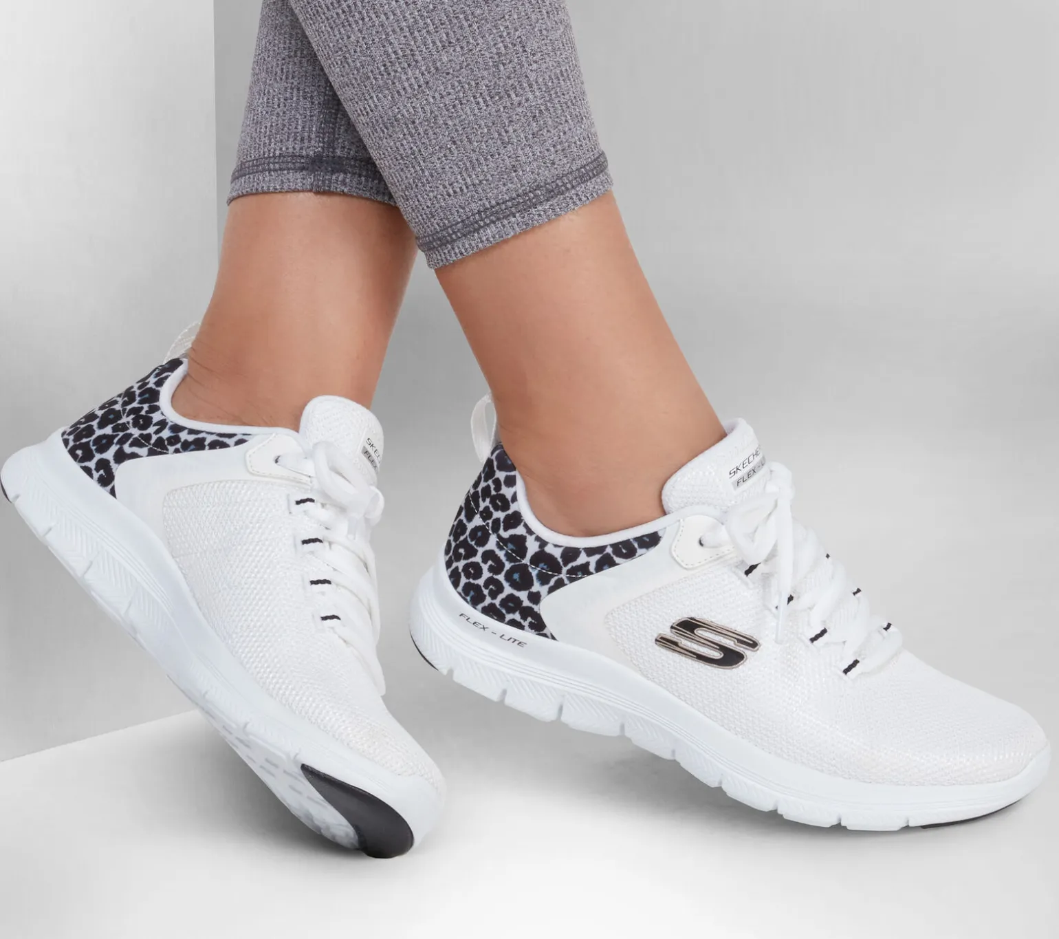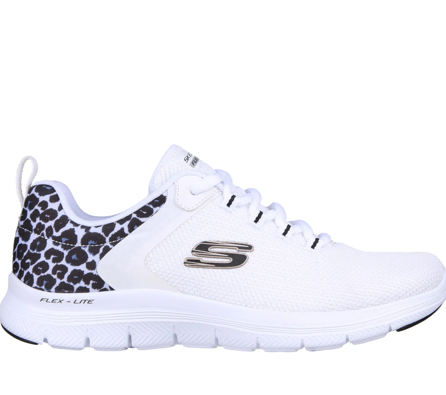 Mit dem superbequemen Skechers Flex Appeal® 4.0 – Wild Ballad heißt es raus aus dem Haus! Dieser vegane sportliche Schnürschuh verfügt über ein Obermaterial aus Mesh, einen Absatz Leoparden-Druck und eine gepolsterte Skechers Air-Cooled Memory Foam®-Innensohle.