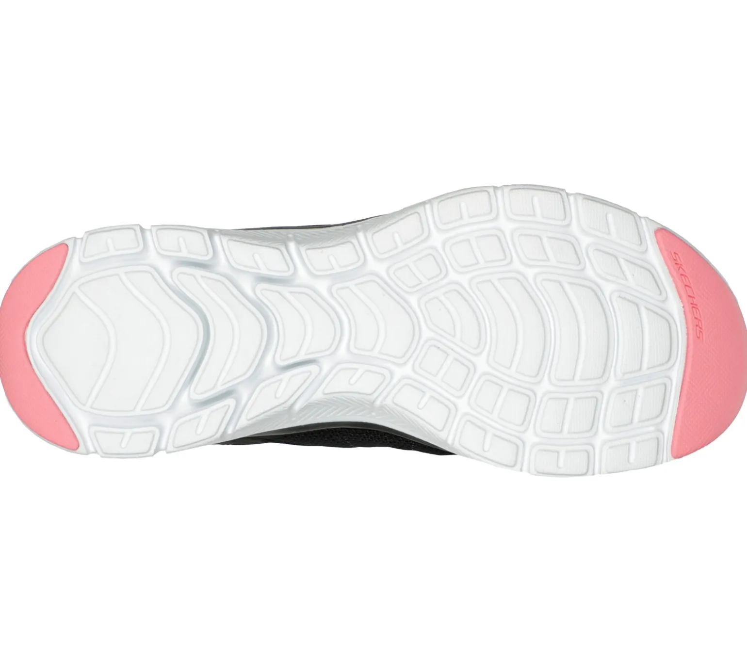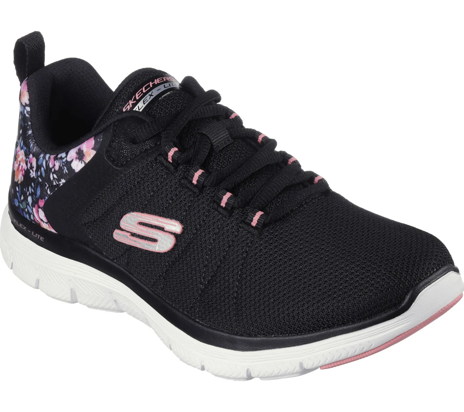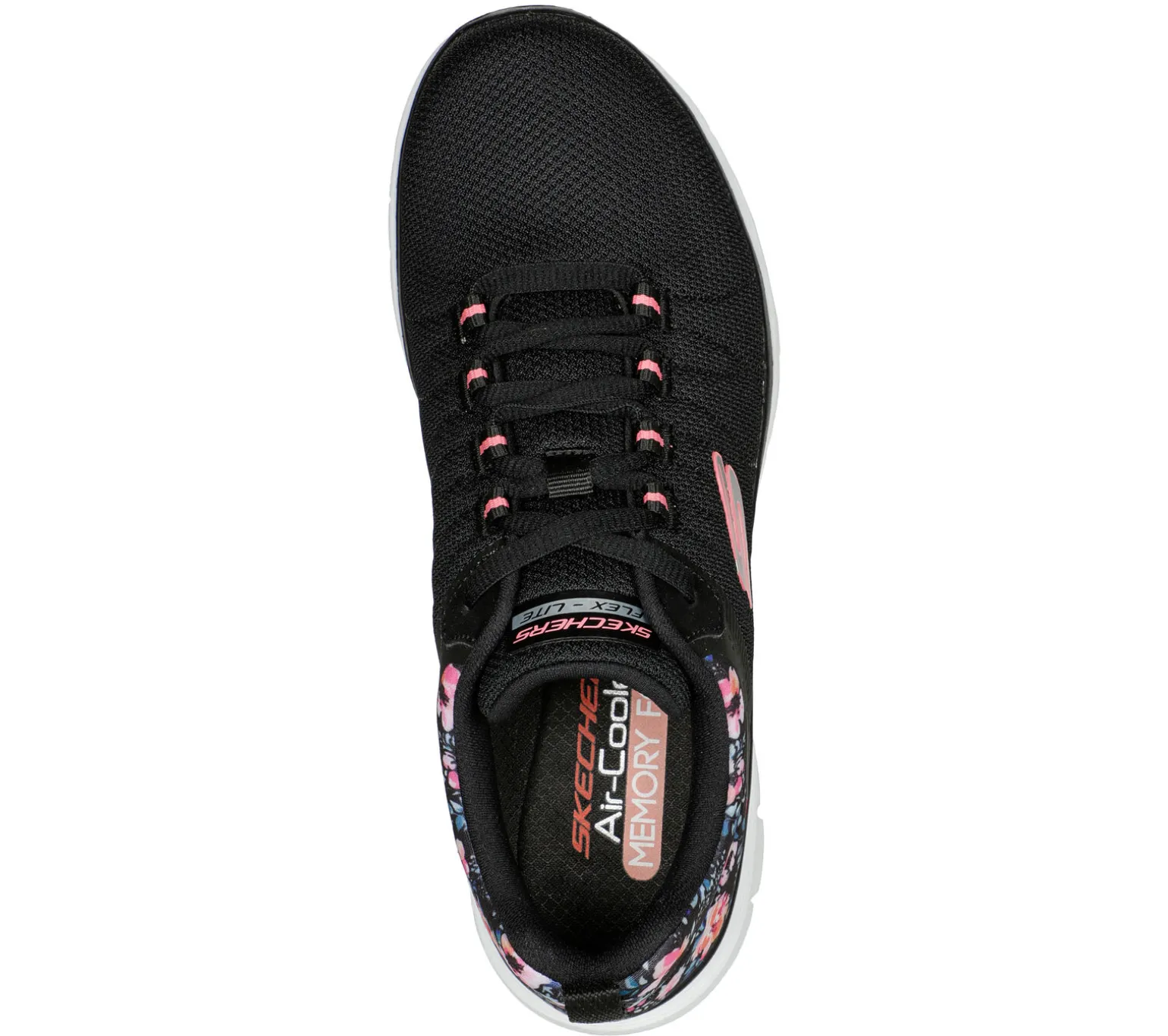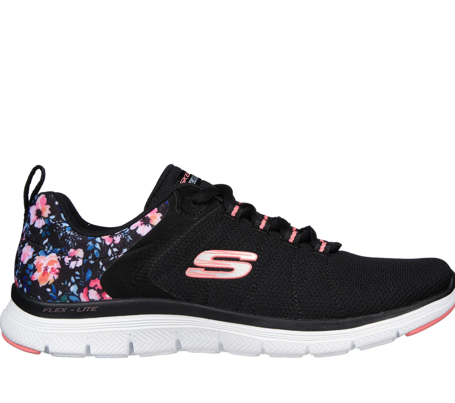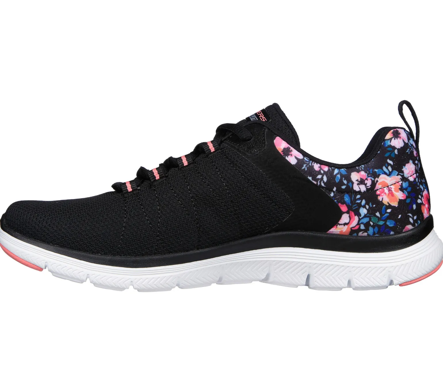 Lege eine Pause ein und genieße den Duft der Rosen in flexiblem Komfort mit dem Skechers Flex Appeal 4.0 – Let It Blossom. Dieser vegane Sneaker mit Schnürung verfügt über ein teilsynthetisches Obermaterial aus Mesh, einen Fersenbesatz mit Blumenprint und eine gepolsterte Skechers Air-Cooled Memory Foam®-Innensohle.