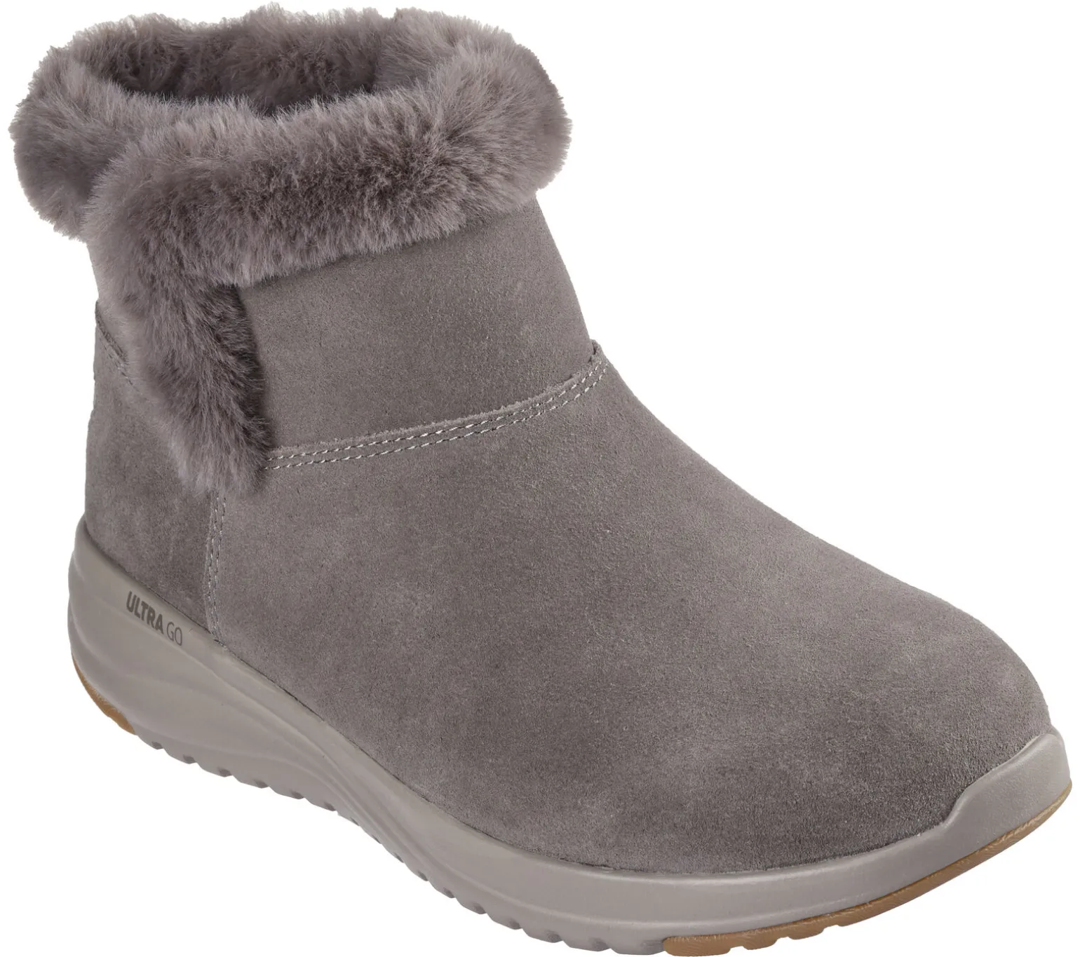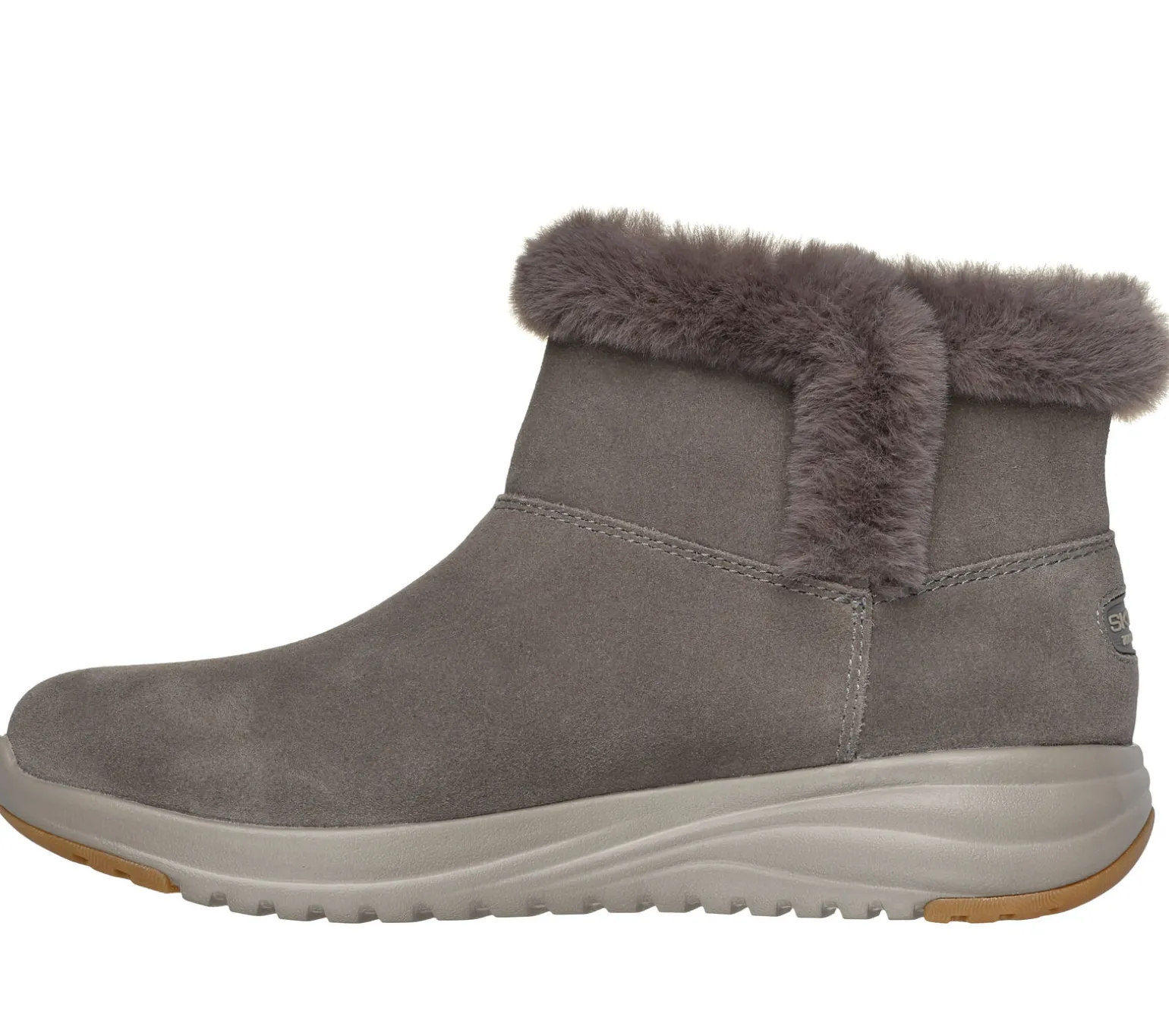 Genieße die Behaglichkeit einer klassischen Stiefelette im Shearling-Stil mit erstklassigem Skechers-Komfort im Skechers On-the-GO® Stellar – Cozy Step. Dieser wasserdichte Stiefel zum Überstreifen verfügt über ein Obermaterial aus Wildleder mit Kunstpelzfutter und -besatz, eine Air-Cooled Goga Mat-Innensohle mit hoher Rückfederung sowie eine leichte ULTRA GO®-Zwischensohle mit Dämpfung.
