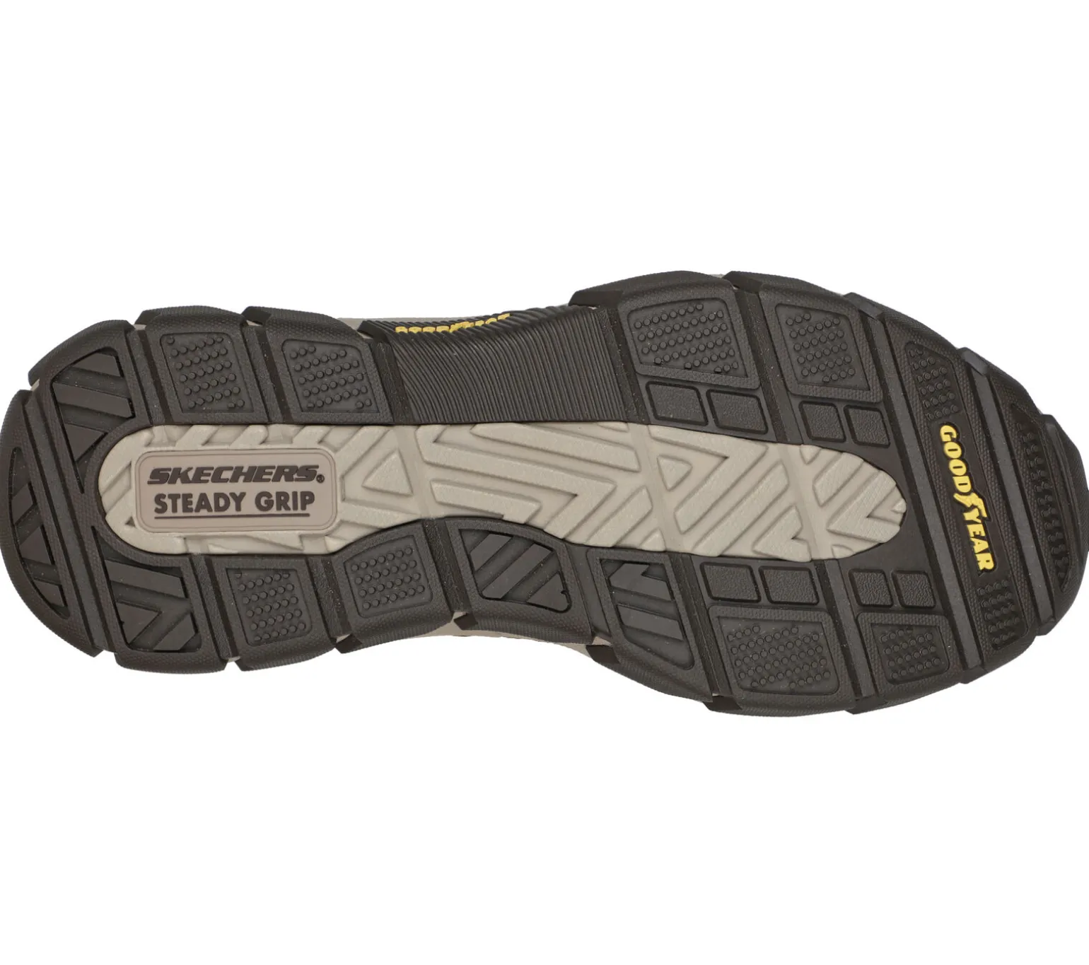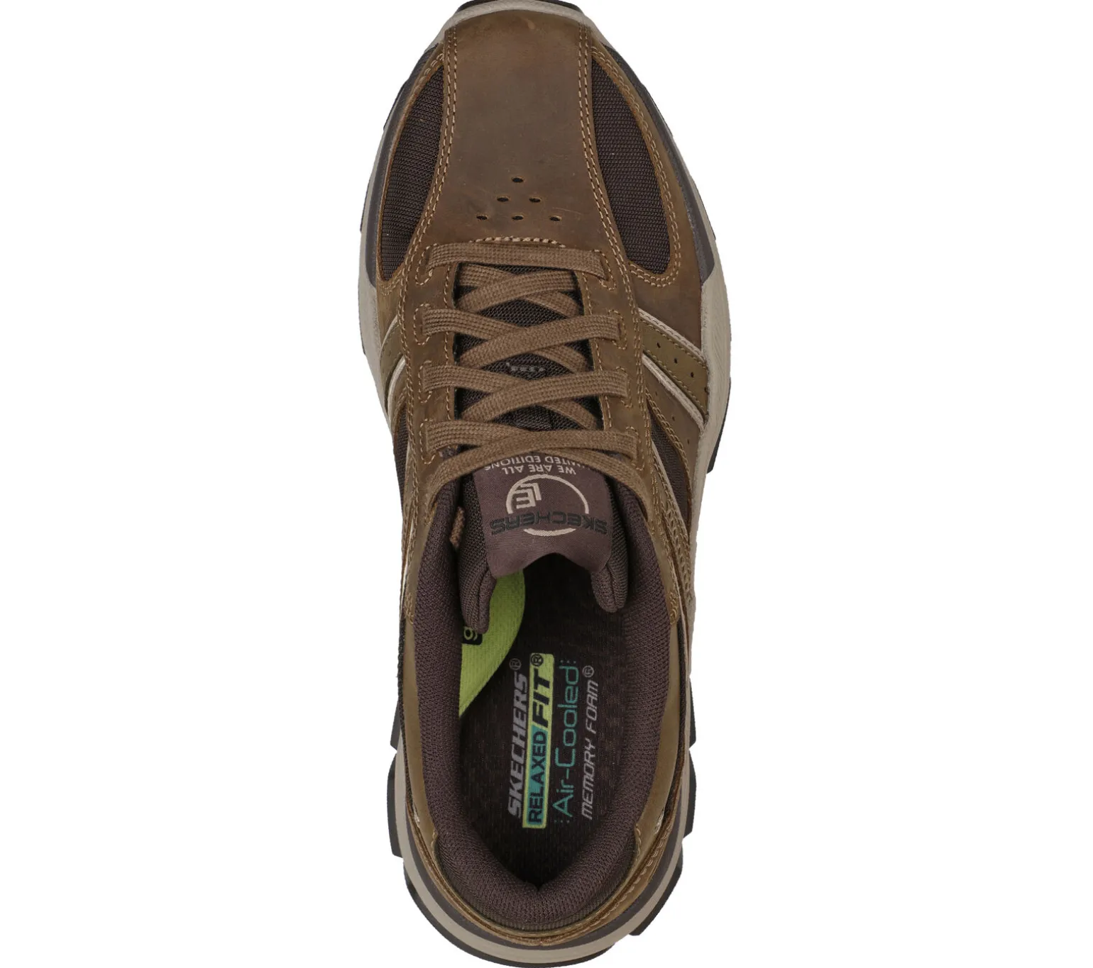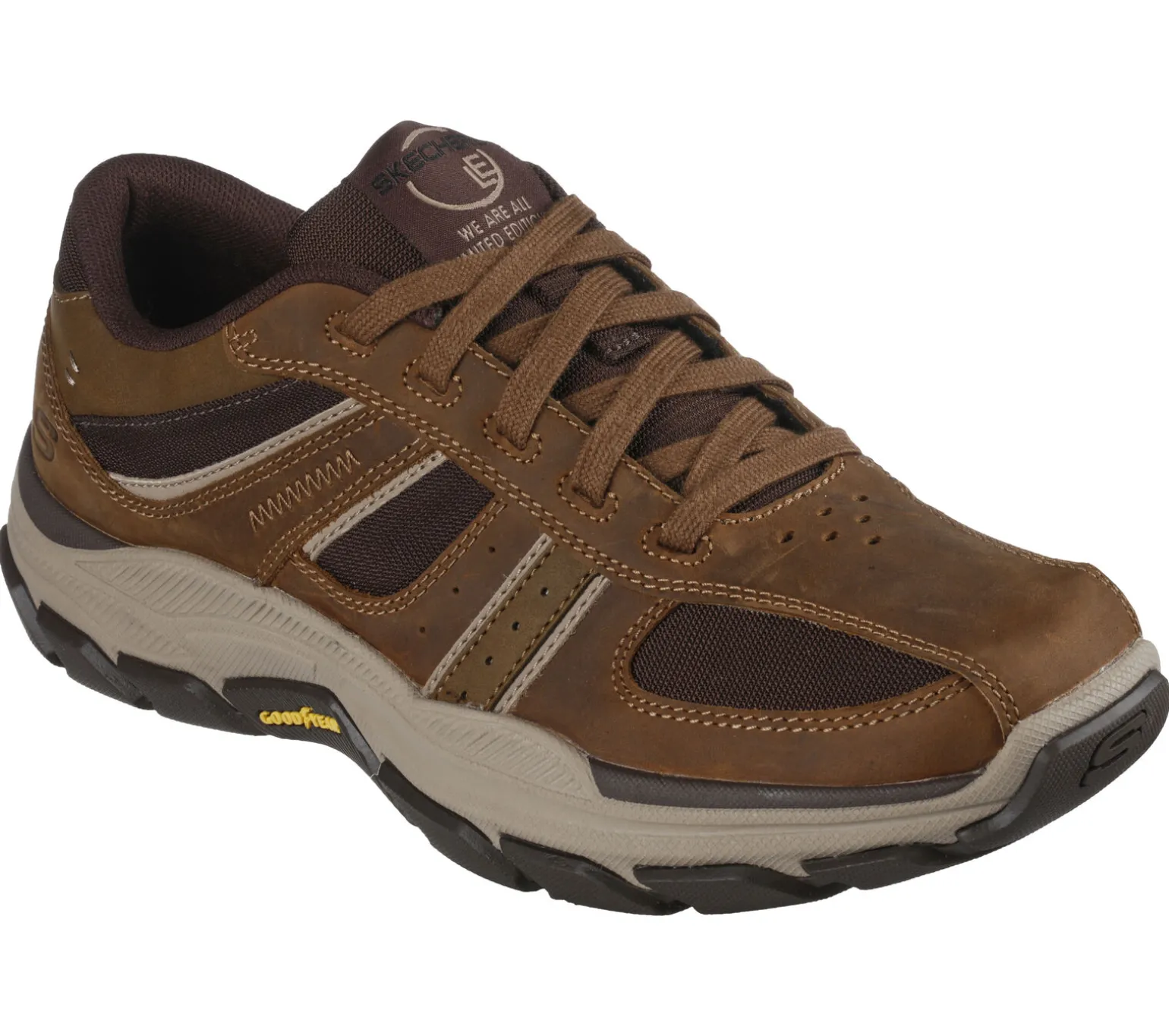 Klassischer Stil erhält ein Update in modernem Komfort mit Skechers Relaxed Fit®: Respected – Edgemere. Dieser Schnürschuh verfügt über ein Obermaterial aus Leder mit einer schmalen Zehe, eine gepolsterte Skechers Air-Cooled Memory Foam®-Innensohle, Skechers Goga Mat Arch-Dämpfung für zusätzlichen Halt und eine haltbare Goodyear® Performance-Laufsohle mit Steady Grip.