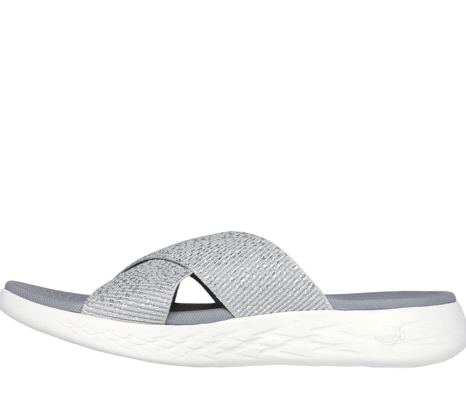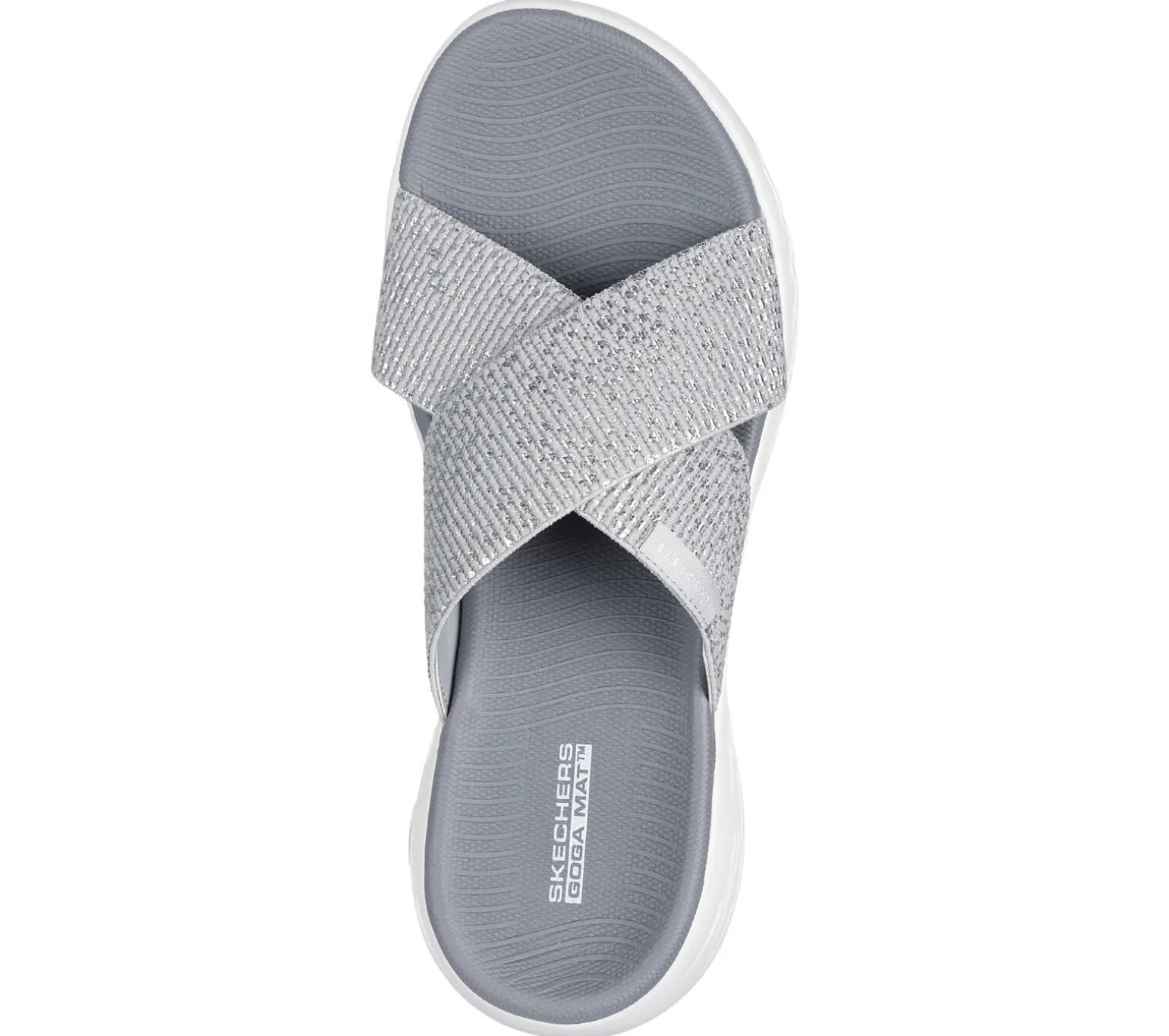 Mit der bequemen Skechers On-the-GO 600 – Glistening-Sandale strahlst du noch mehr an sonnigen Sommertagen. Diese sportliche, offene Riemensandale verfügt über ein Obermaterial aus Mesh mit Metallic-Finish. eine leichte, dämpfende 5GEN®-Zwischensohle und ein vorgeformtes Goga Mat®-Komfortfußbett.