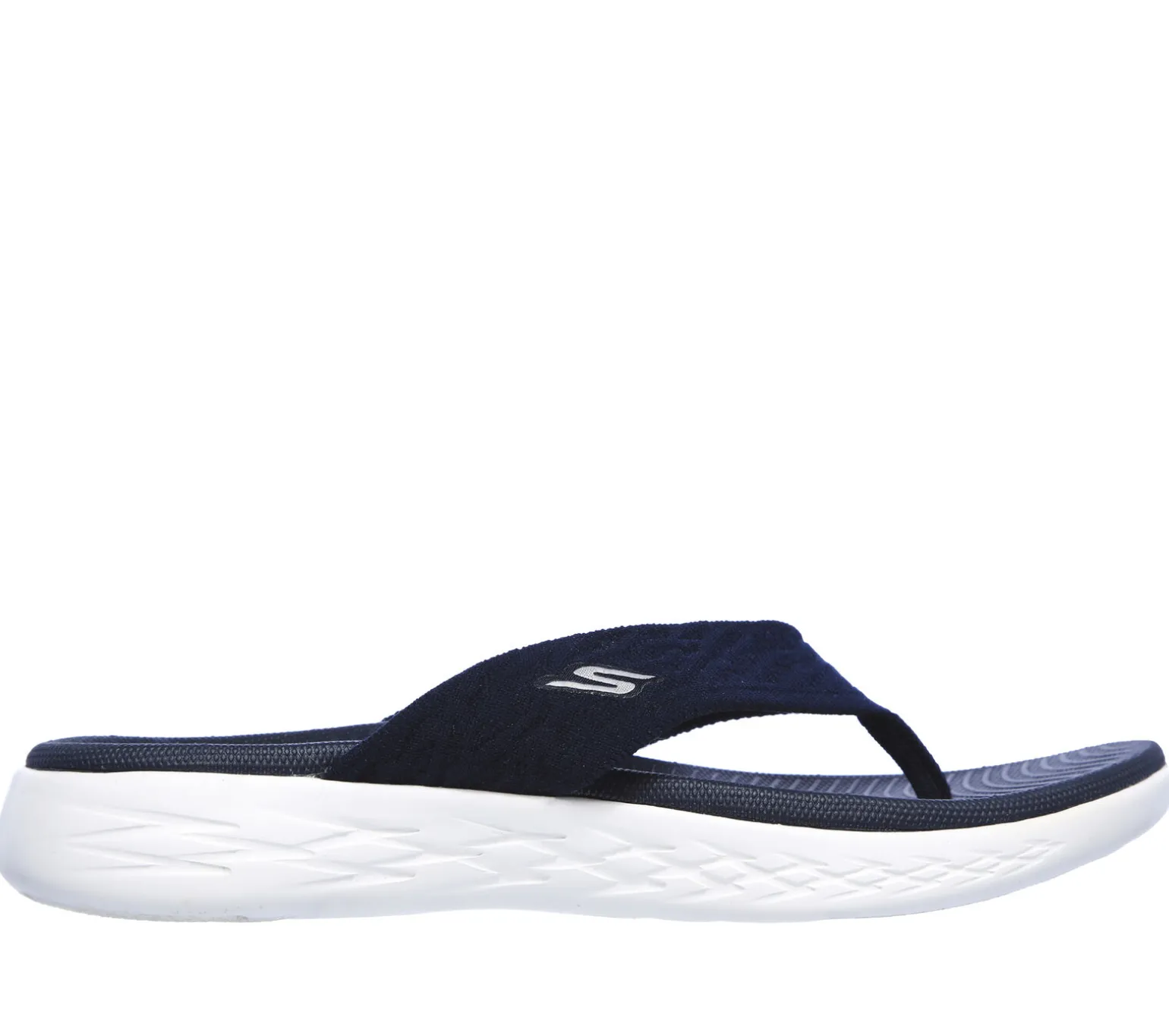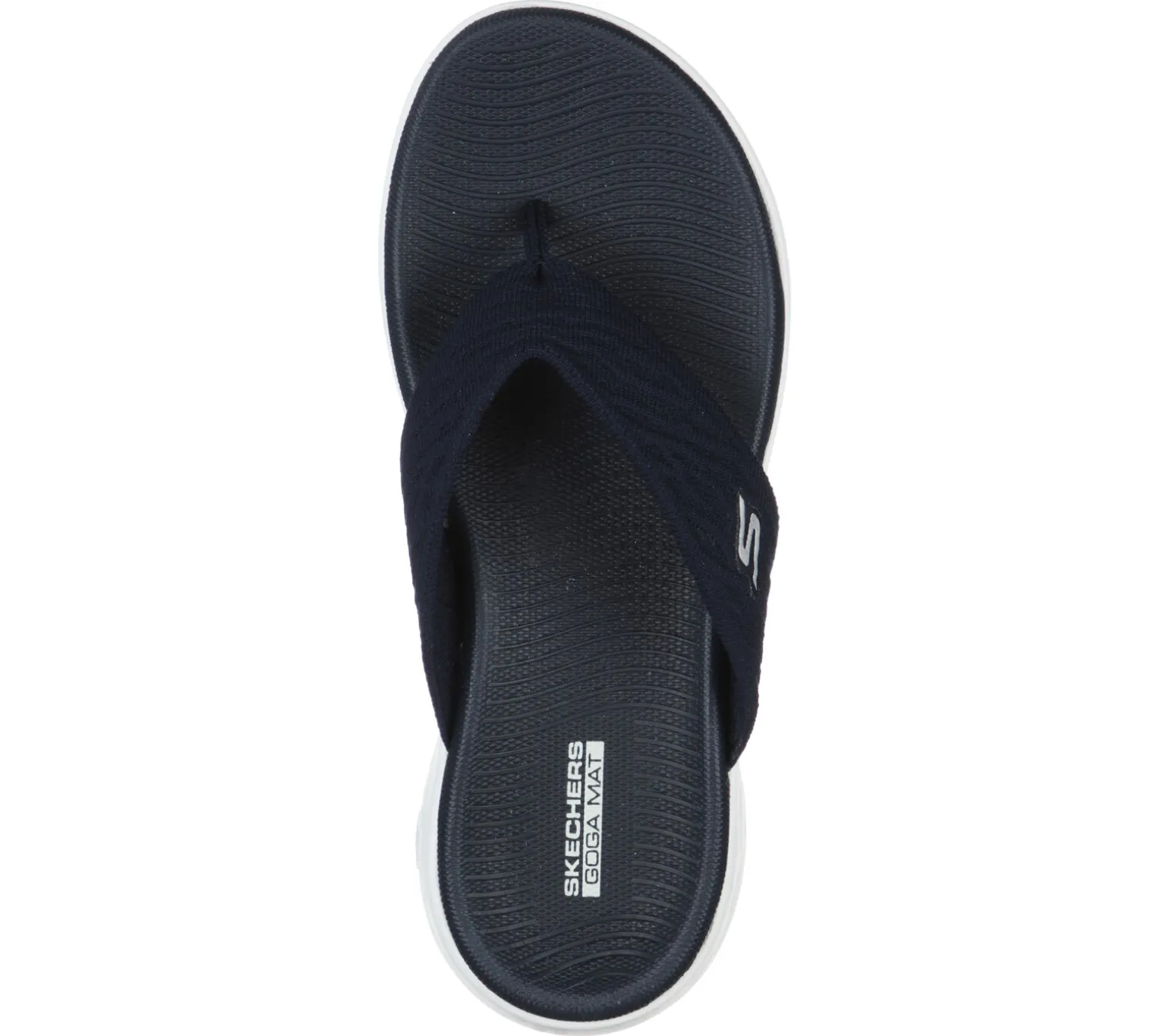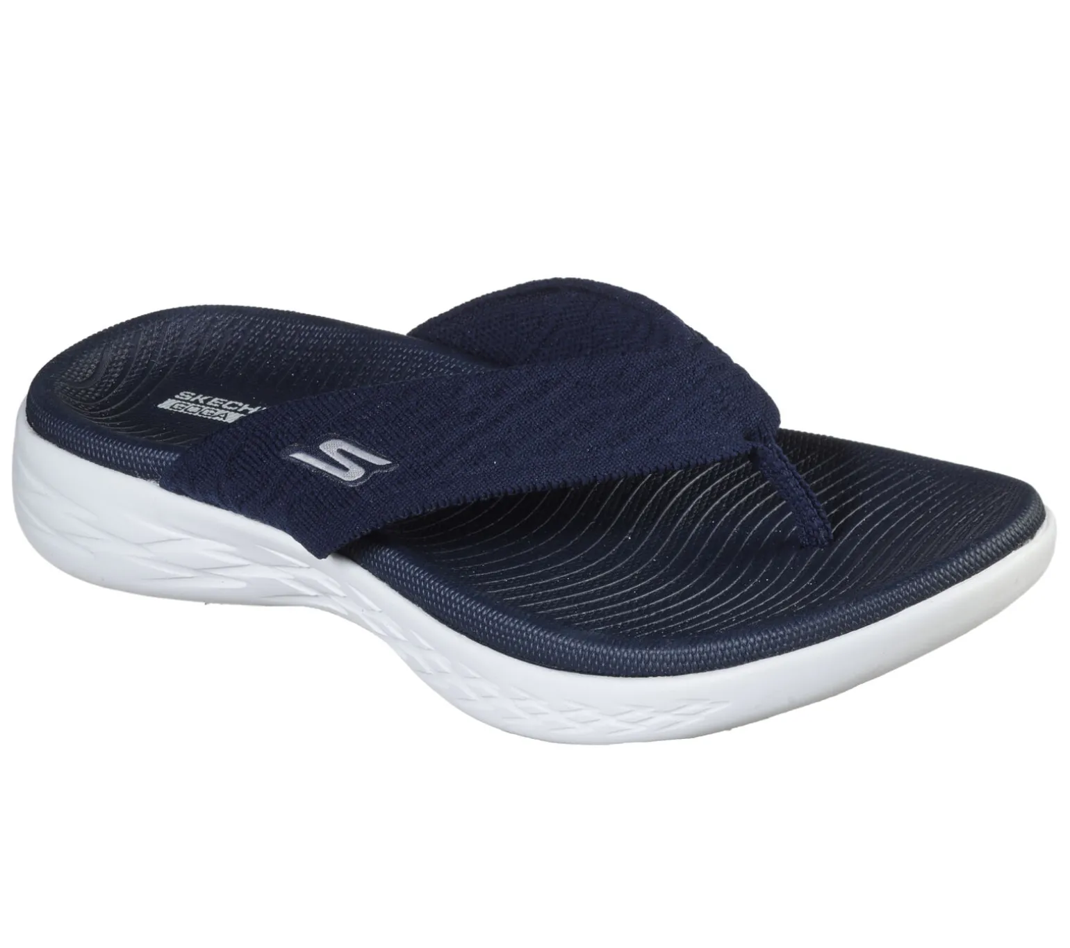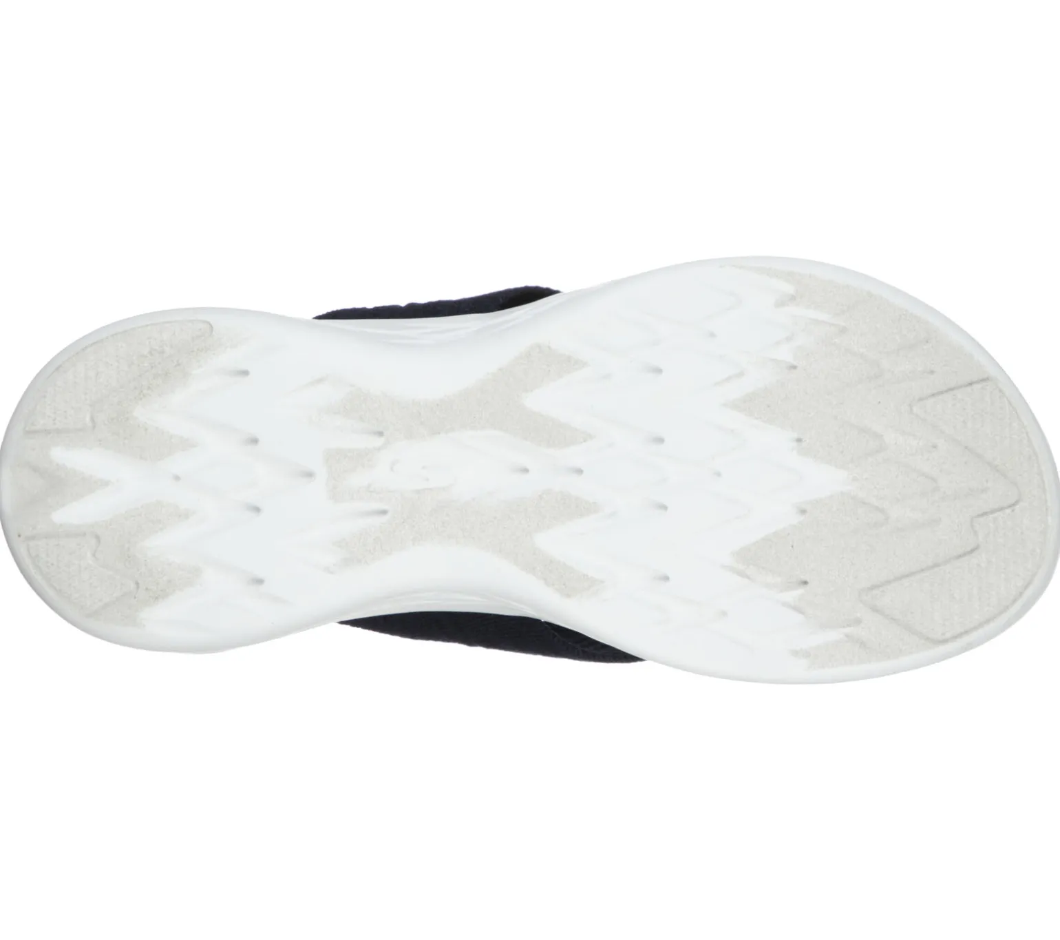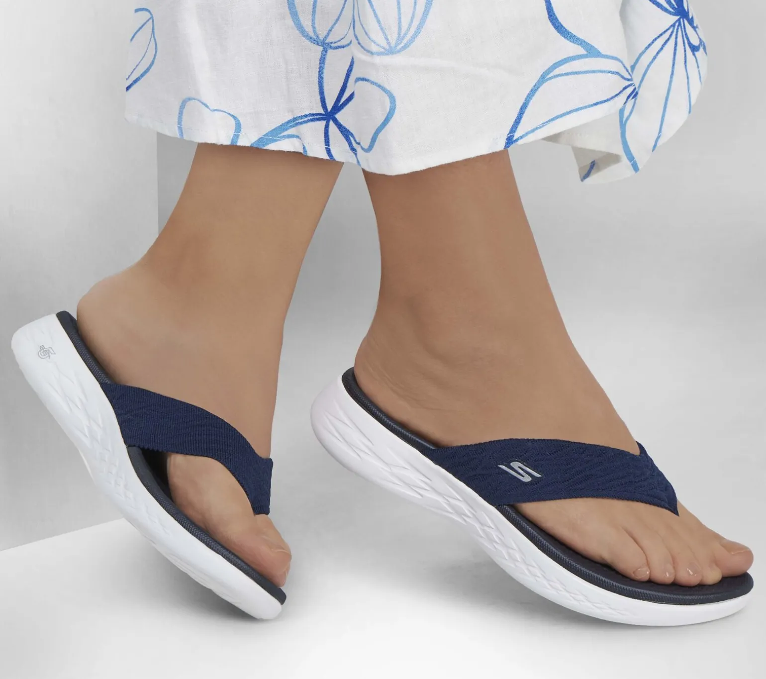 Dank der Skechers On-the-GO 600 – Sunny bequem und stilvoll durch warme Tage. Diese sportliche 3-Punkt-Zehenstegsandale verfügt über ein Obermaterial aus weichem, gewebtem Mesh, ein stützendes, konturiertes Goga Mat® Fußbett, eine leichte 5GEN®-Dämpfung und eine GO RUN® 600 Laufsohle.