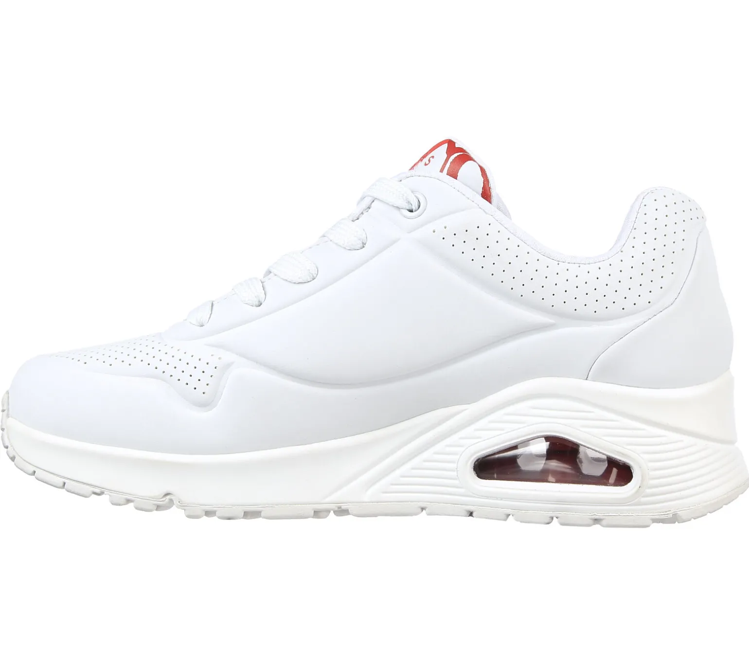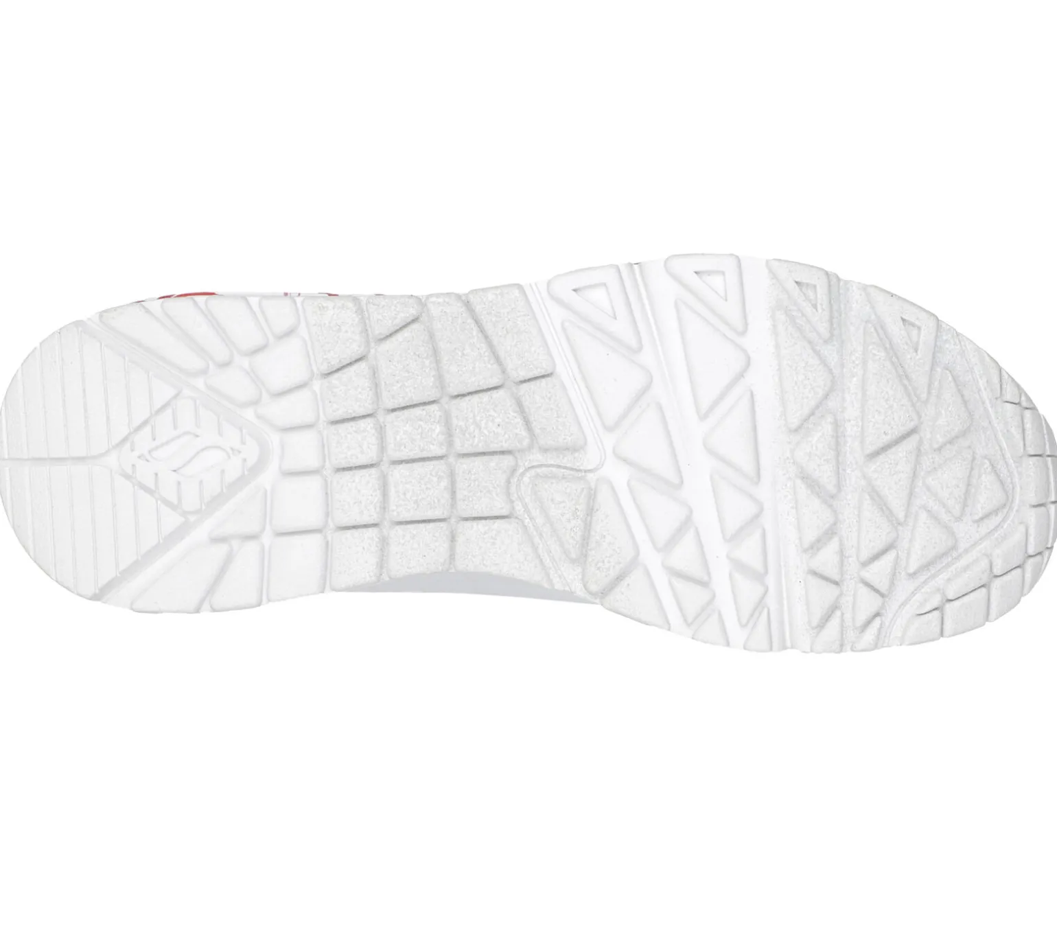 Der international renommierte Wandmaler James Goldcrown veredelte in der Skechers x JGoldcrown Kollektion ausgewählte Styles mit seinen ikonischen Lovewall-Herzdesigns. Zeige den kreativen Look der Skechers x JGoldcrown: Skechers Street Uno -B Spread the Love. Dieser modische Sneaker mit Schnürung verfügt über einen Allover-Print des charakteristischen Herz-Designs des Künstlers, das sich bis zur Außensohle erstreckt, ein Obermaterial aus synthetischem Durabuck und perforierten Besatz mit einer Skechers Air-Cooled Memory Foam®-Innensohle und einen Plateau-Keilabsatz mit sichtbarer, luftgepolsterter Skech-Air®-Zwischensohle.