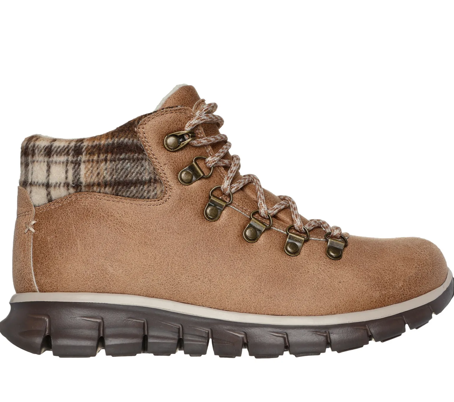 Follow those paths in cozy comfort wearing Skechers Synergy – Plaid Mood. This 3M® Scotchgard® treated hiker-style sneaker boot features a distressed vegan leather upper with a padded ‚plaid blanket‘ collar and a cushioned Warm Tech Memory Foam insole.
