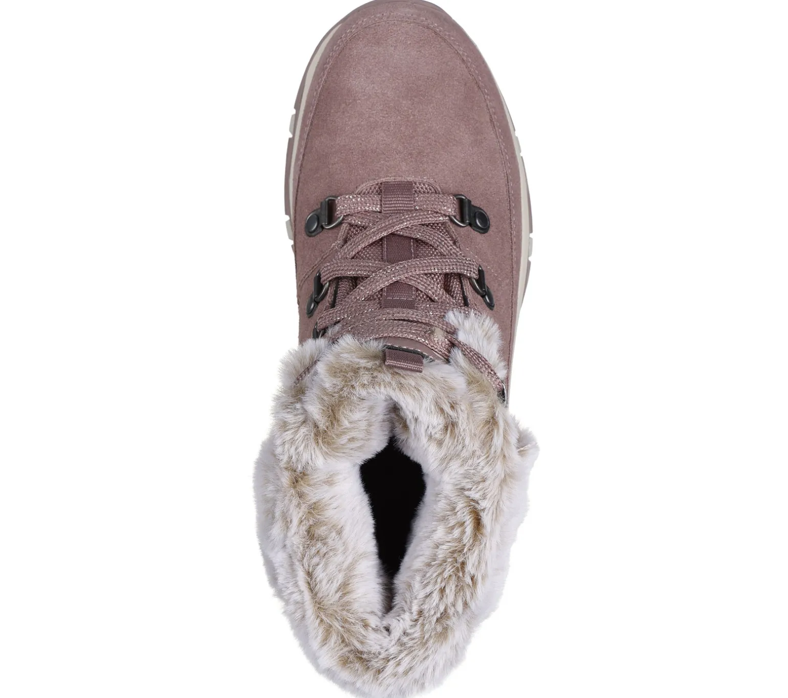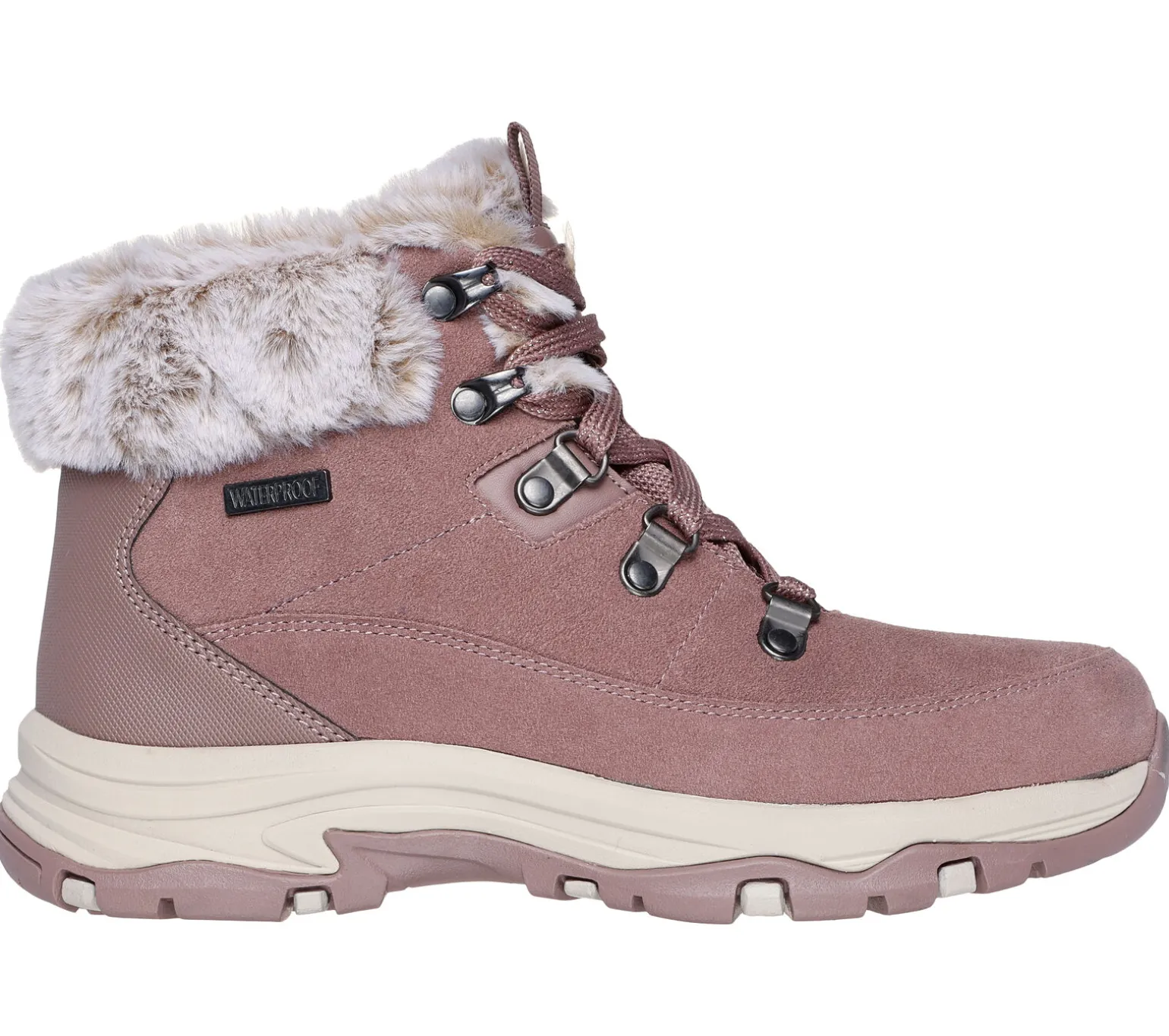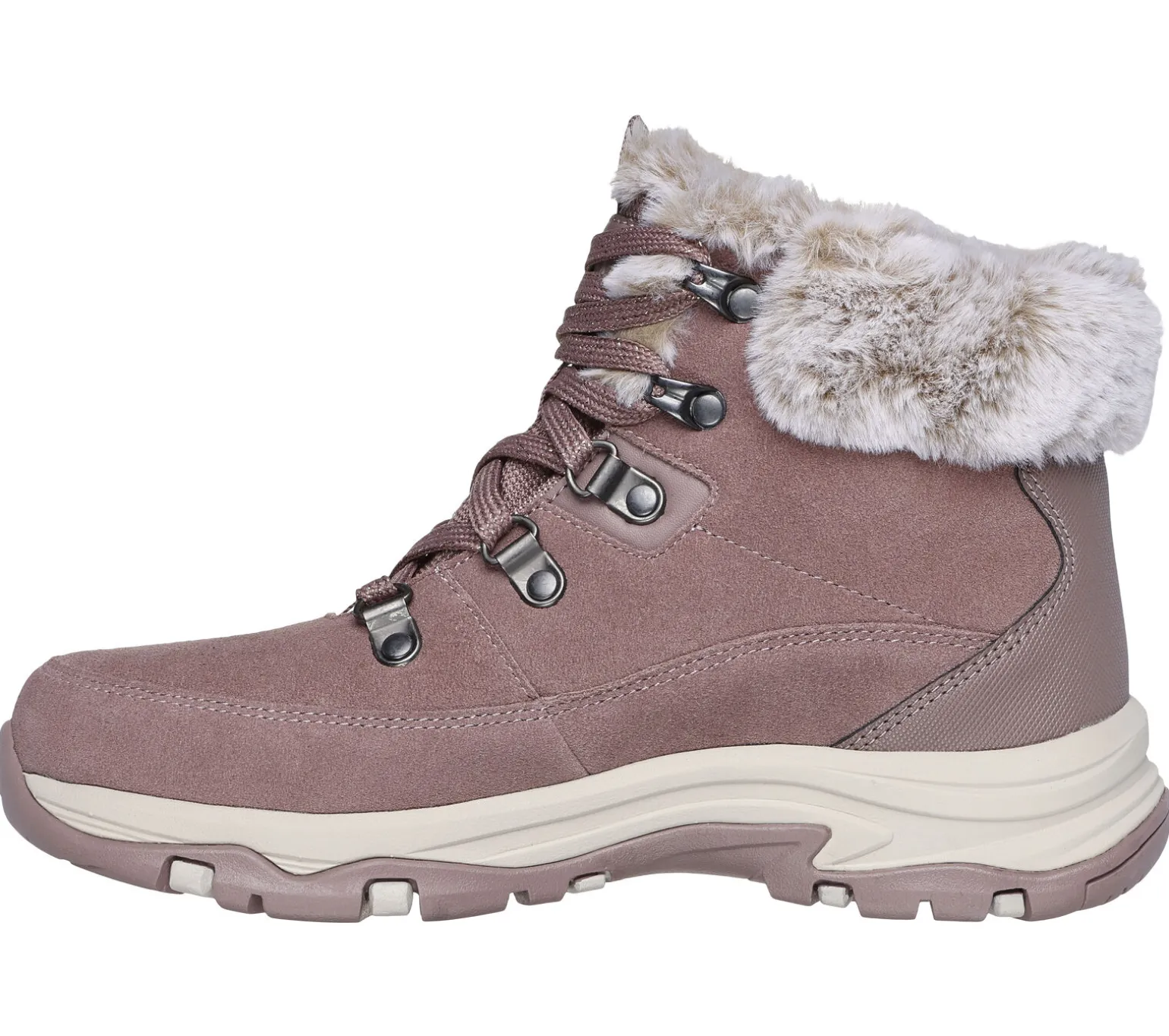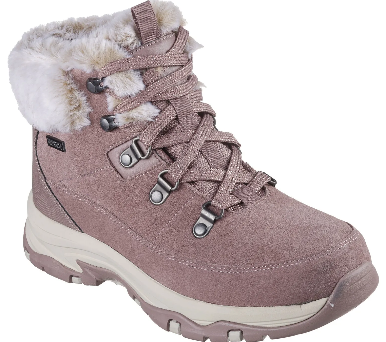 Stilvoll und komfortabel wandern im Skechers: Trego – Snow Worries. Dieser wasserdichte Wanderstiefel für kalte Tage verfügt über ein Obermaterial aus Veloursleder mit glitzernder Schnürung, einen Kragen und Futter aus Kunstpelz und eine gepolsterte Skechers Air-Cooled Memory Foam-Innensohle.