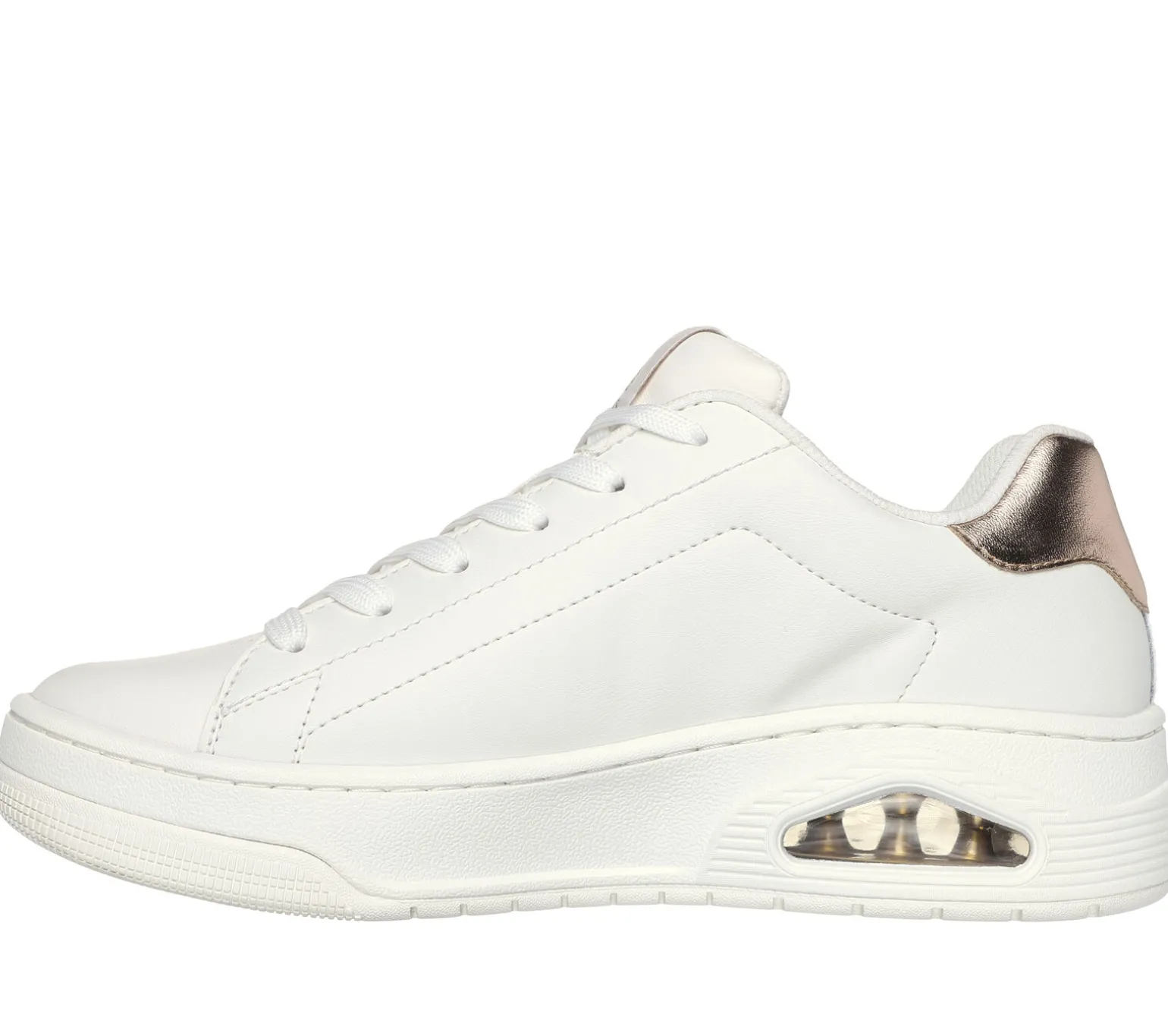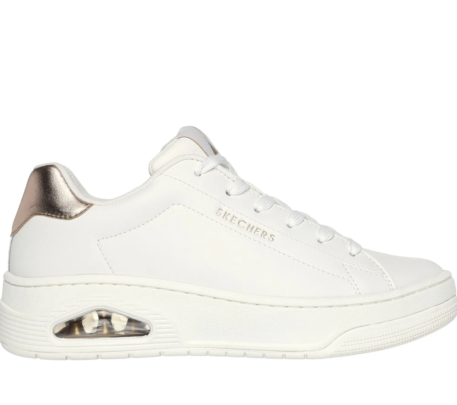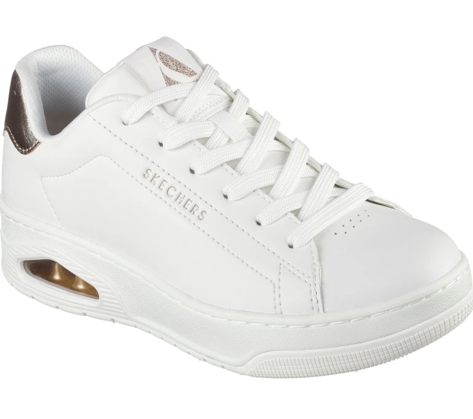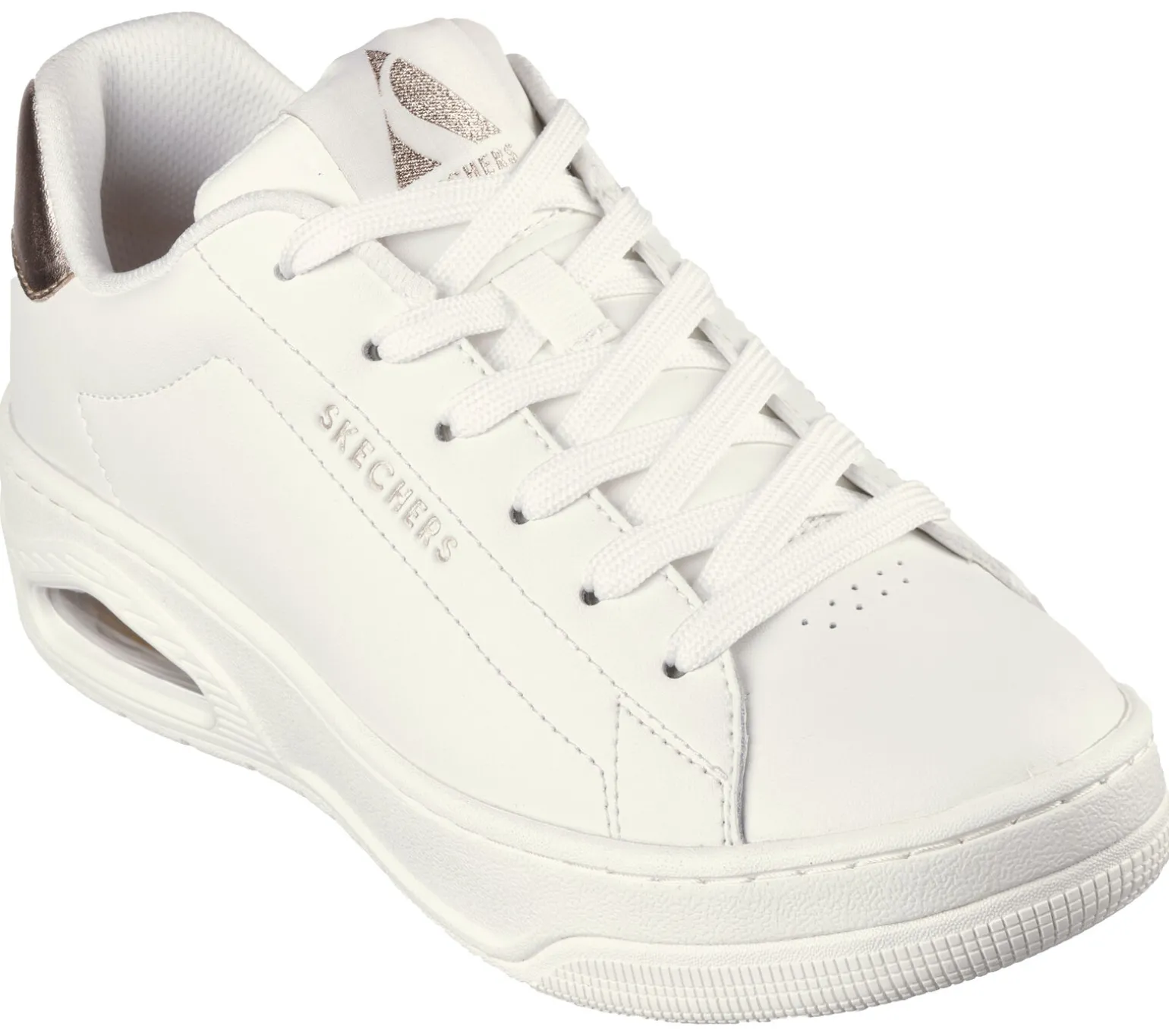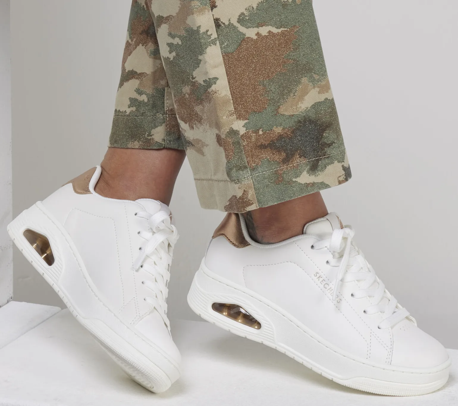 Ein Kultklassiker bekommt mit dem Skechers Street Uno – Courted Air ein frisches Update. Dieser Sneaker mit Schnürung im Tennis-Style verfügt über ein Obermaterial aus synthetischem Duraleder mit metallfarbenem Besatz, eine Skechers Air-Cooled Memory Foam Innensohle und eine sichtbare Skech-Air® Zwischensohle mit Luftkissendämpfung.