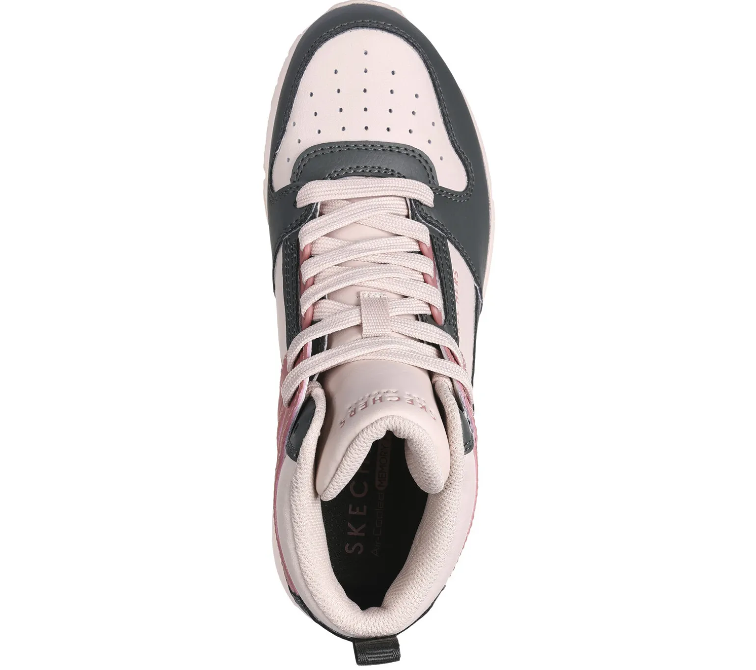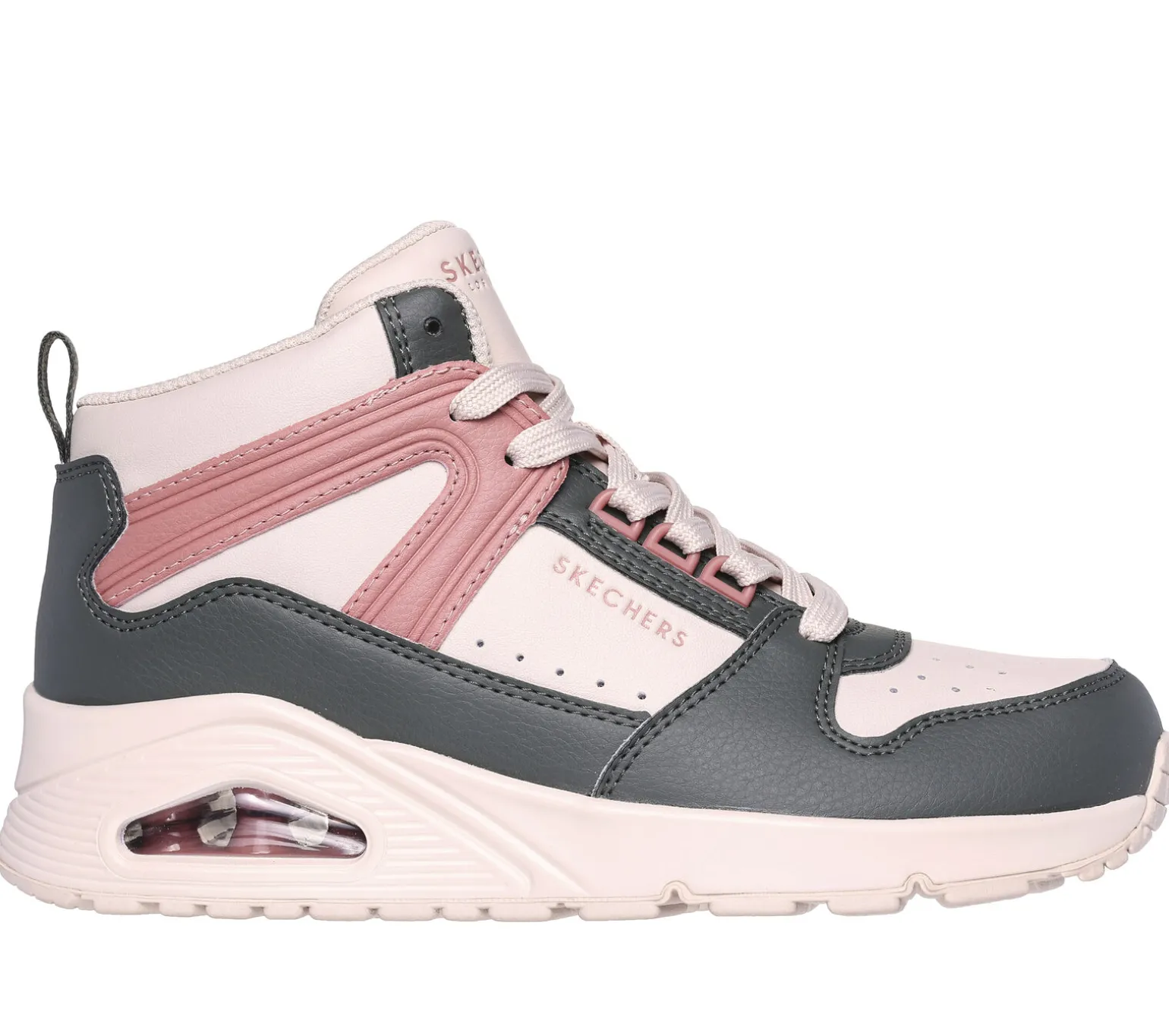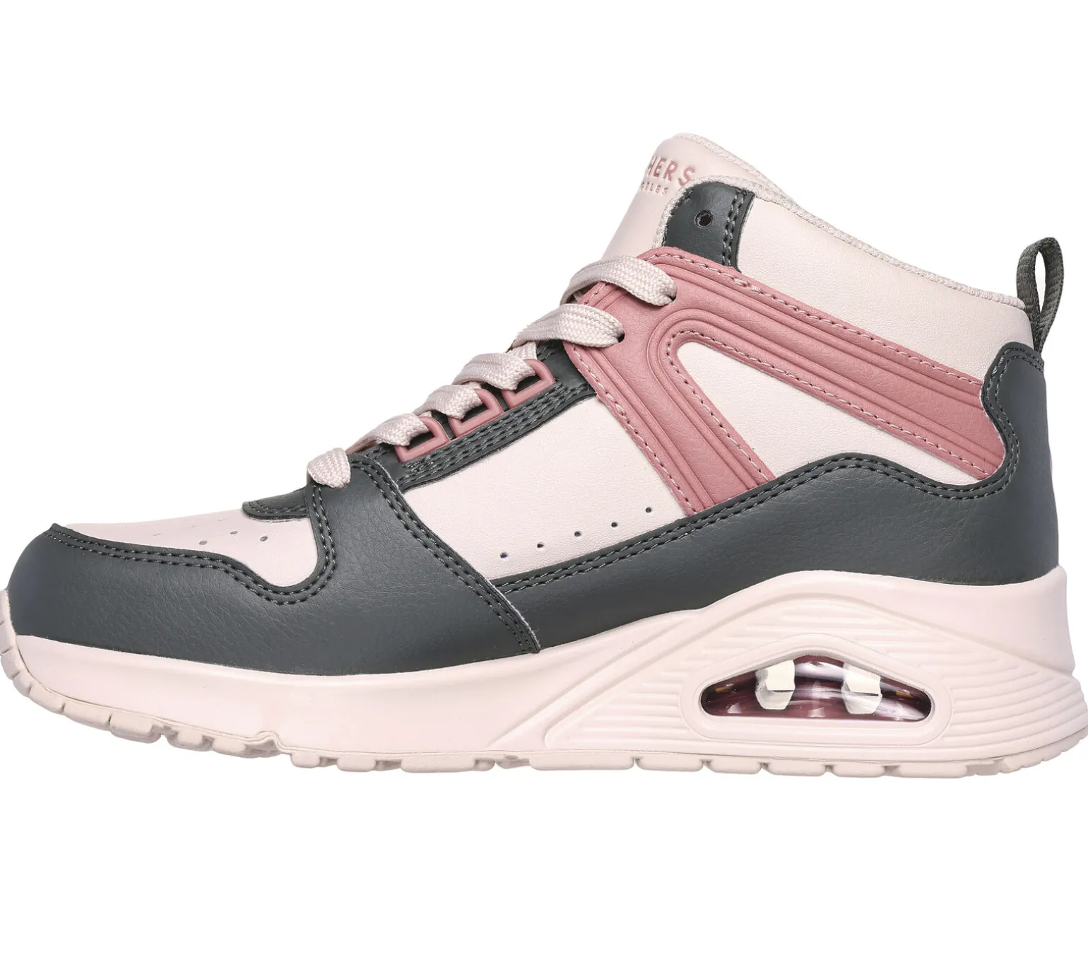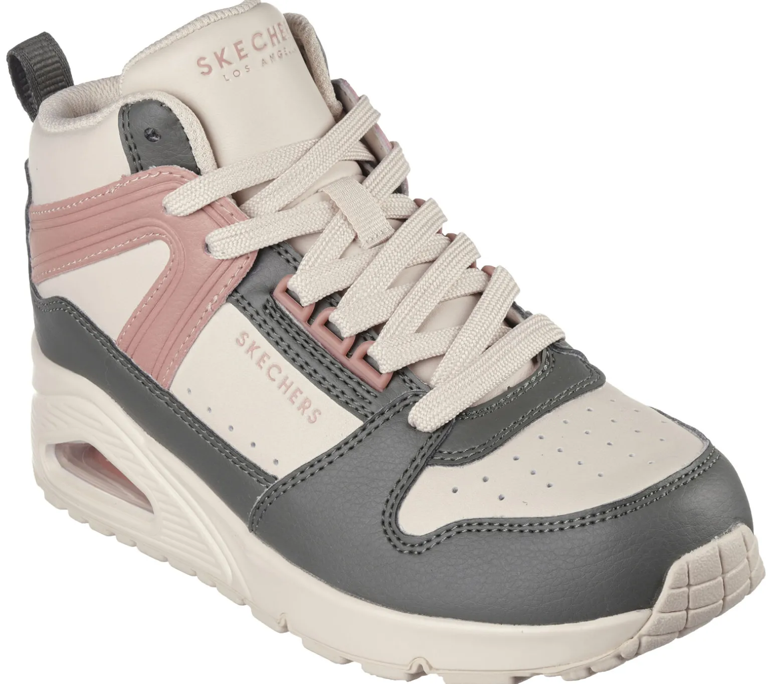Frischer Style und kühler Tragekomfort mit Skechers Street Uno – High Regards. Der modische High-Top-Sneaker zum Schnüren verfügt über ein Obermaterial aus Duraleder, ein sichtbares Airbaig-Zwischensohlendetail und eine Skechers Air-Cooled Memory Foam-Innensohle.