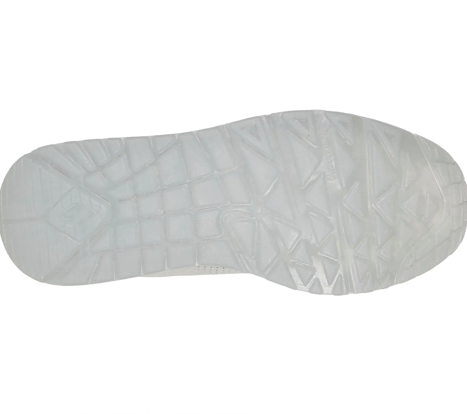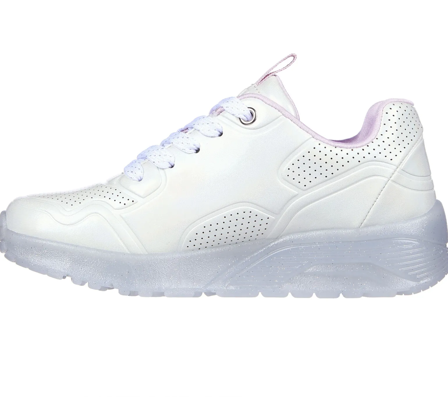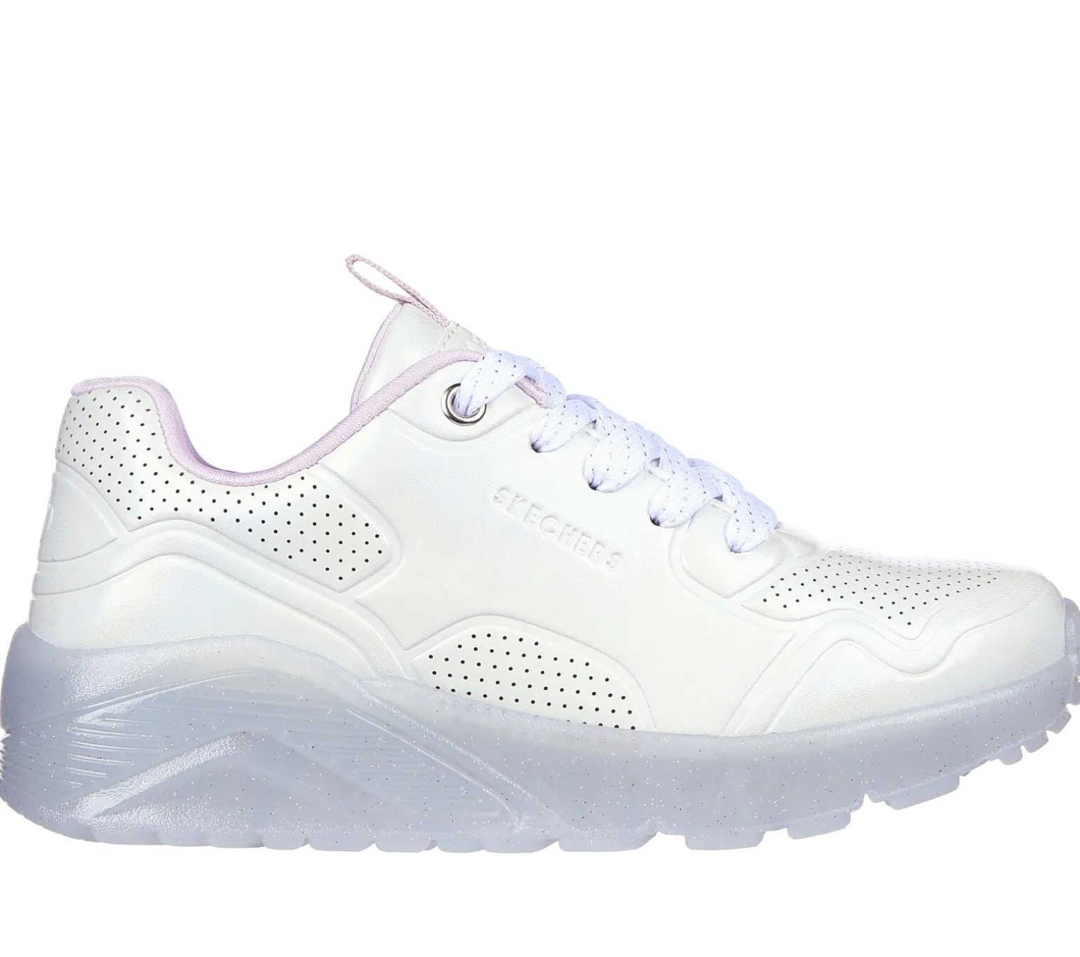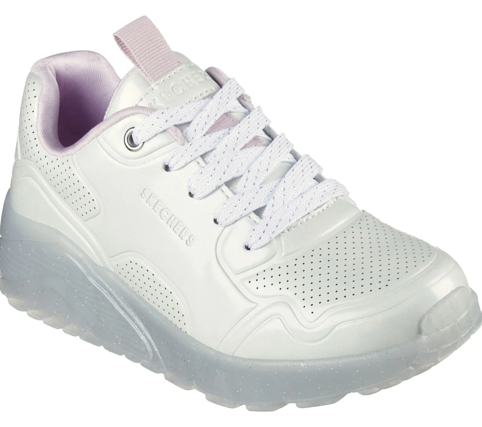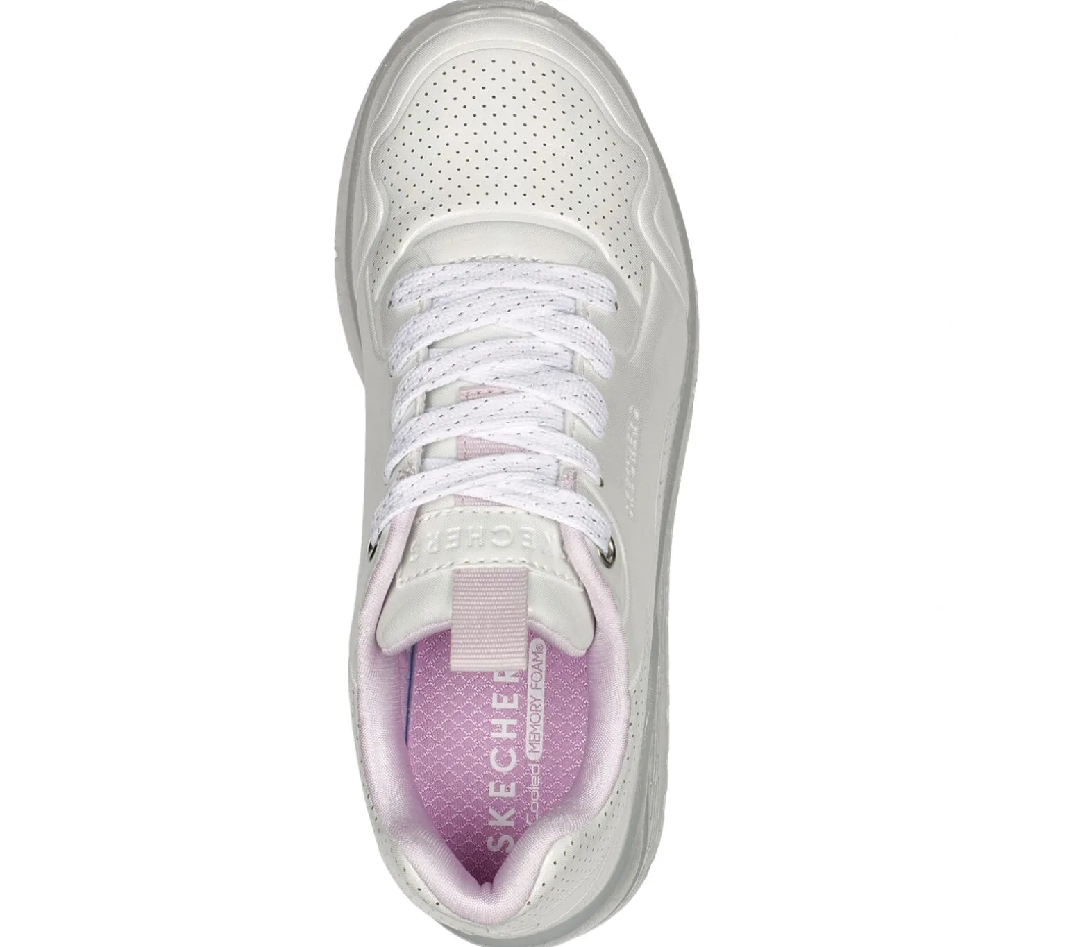 Der Skechers Street Uno Ice – Prism Luxe tut sich durch seinen glamourösen Stil und außergewöhnlichen Komfort nicht umsonst hervor. Dieser modische Schnürschuh verfügt über ein schillerndes synthetisches Obermaterial mit Prägung, eine Skechers Air-Cooled Memory Foam®-Innensohle und eine gepolsterte Plateau-Zwischensohle.