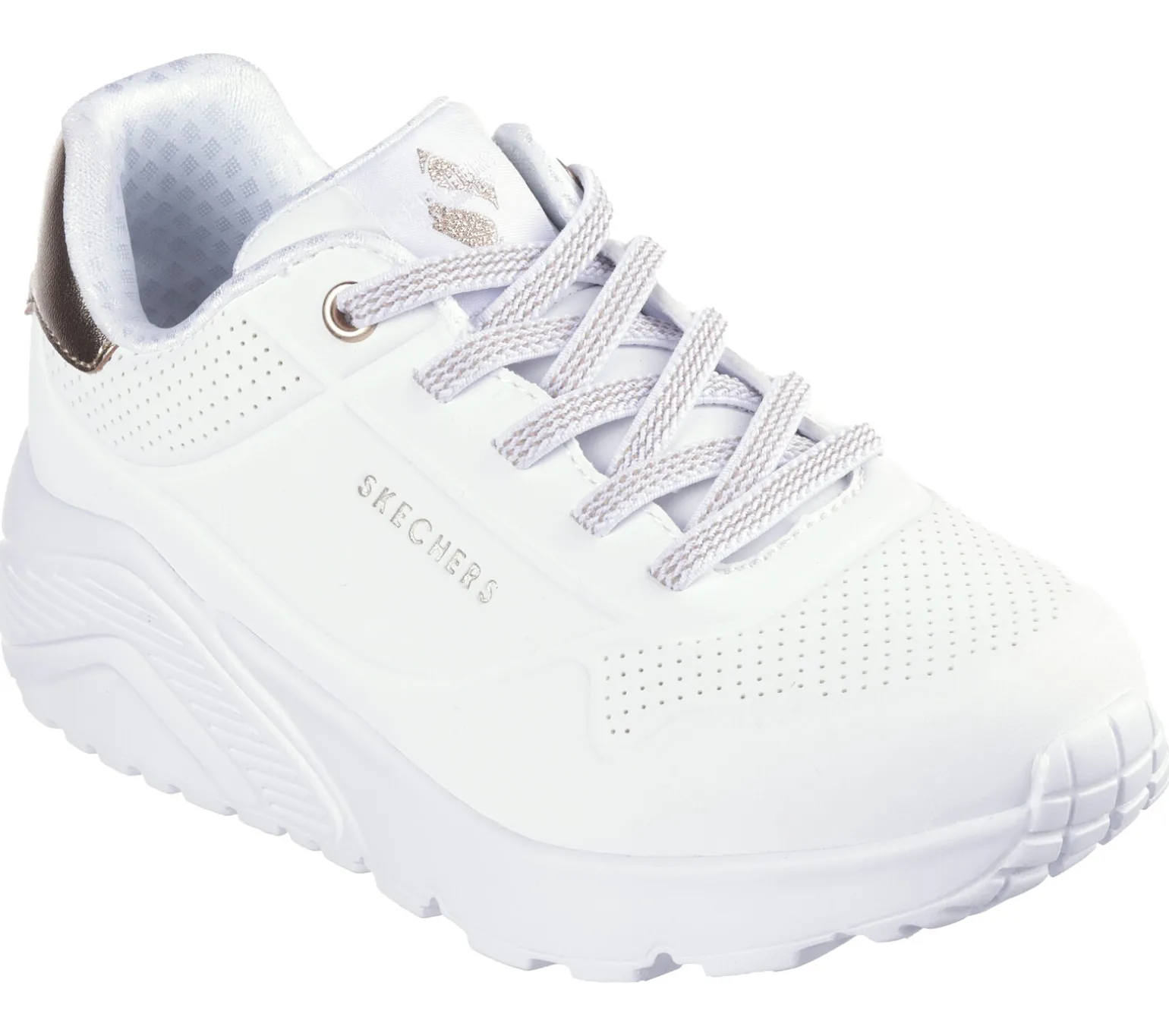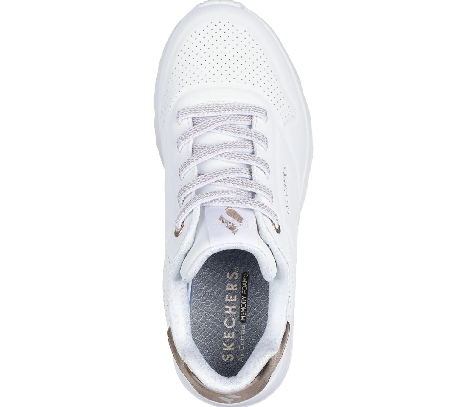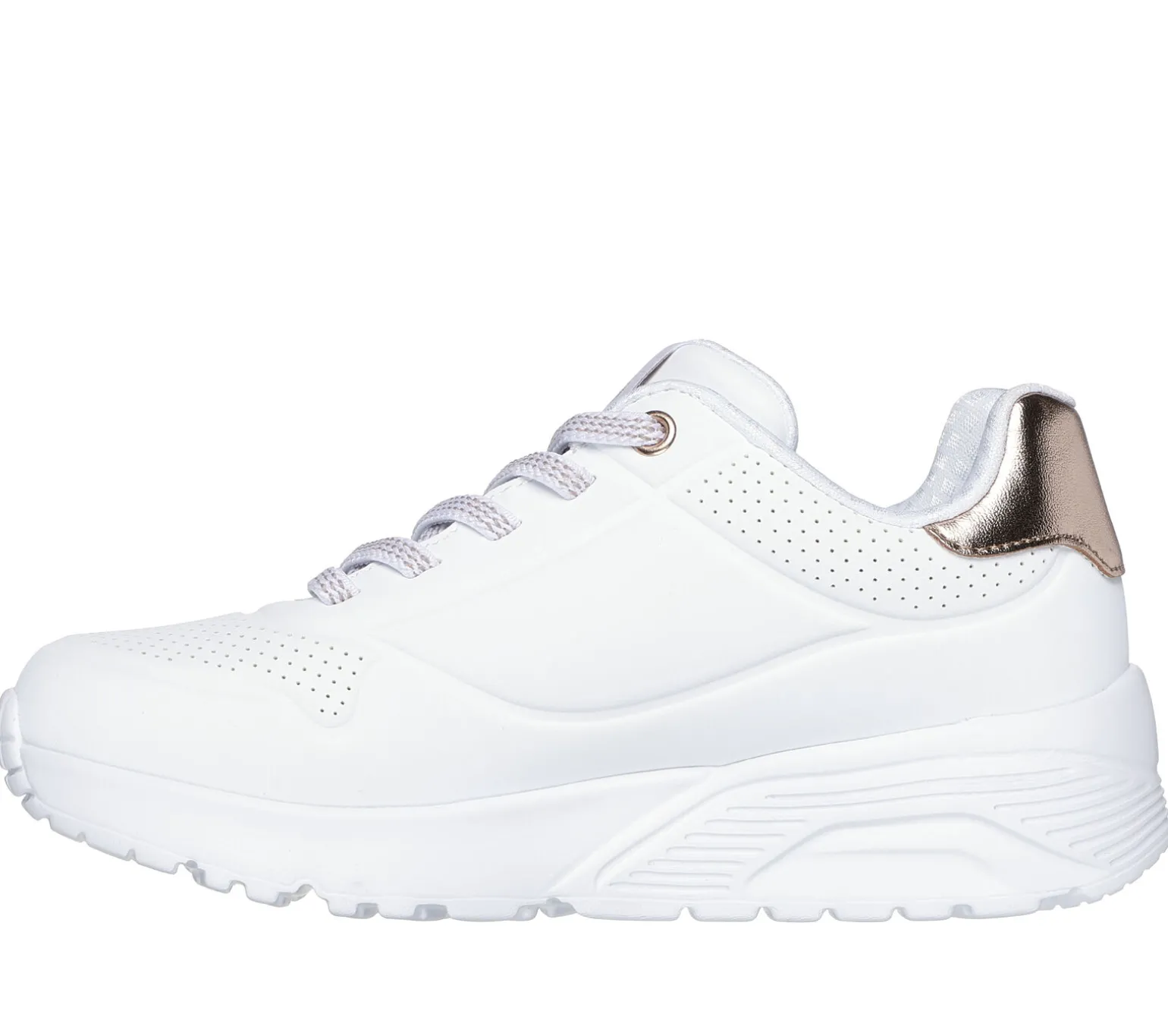 Sichere dir einen stylischen Auftritt mit dem komfortablen Skechers Street Uno Lite. Dieser modische Sneaker mit Stretch-Schnürung verfügt über ein Obermaterial aus synthetischem Durabuck mit Metallic-Details, einen verstellbaren Skechers-Verschluss, eine Skechers Air-Cooled Memory Foam-Innensohle und eine gepolsterte Plateau-Zwischensohle.