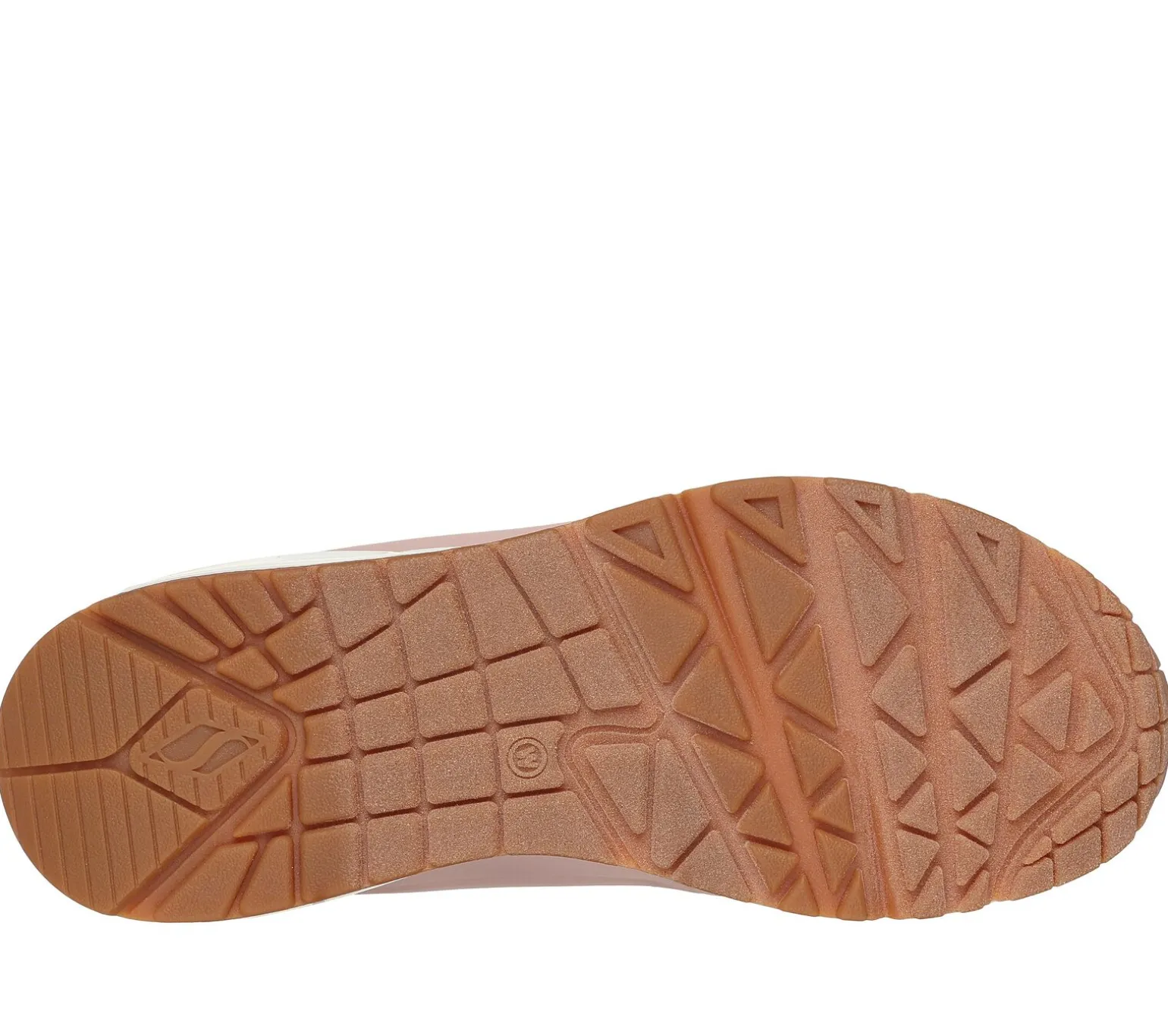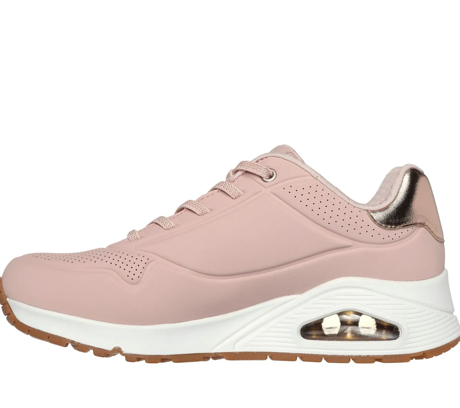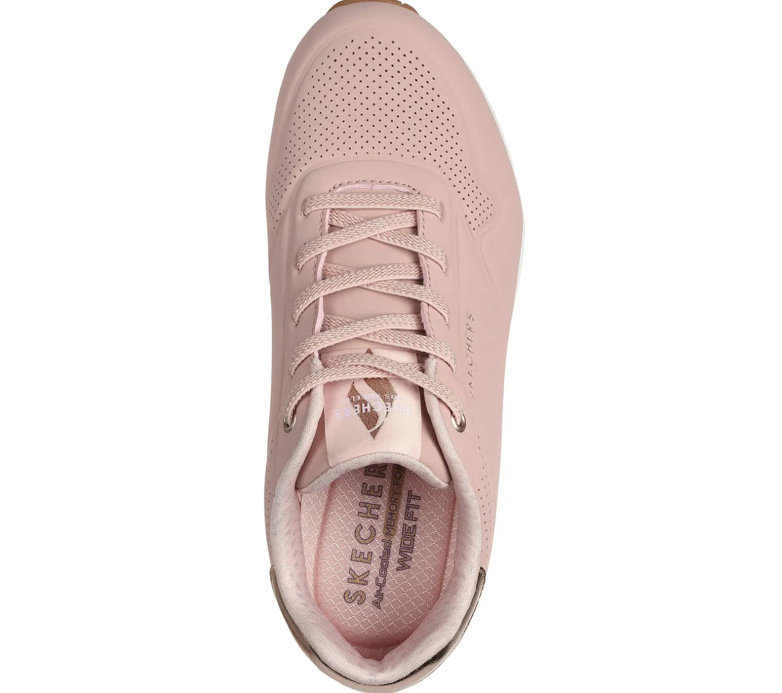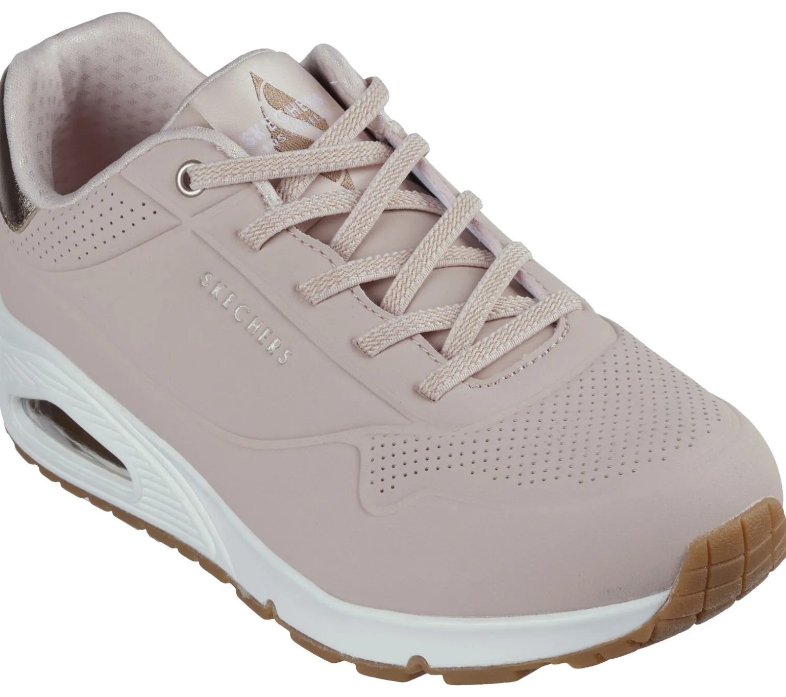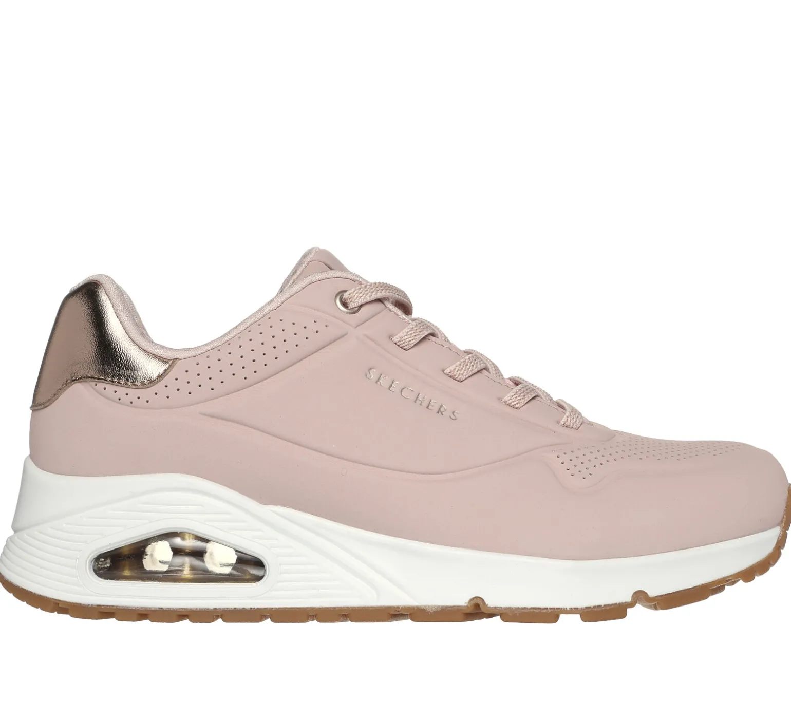 Der Skechers Street Uno – Shimmer Away ist ein klassischer Slip-On, der keine Kompromisse beim Komfort eingeht. Dieser modische Sneaker verfügt über ein Obermaterial aus synthetischem Durabuck mit Metallbesatz, Bungee-Schnürung, eine Skechers Air-Cooled Memory Foam®-Einlegesohle und eine sichtbare, luftgepolsterte Skech-Air®-Zwischensohle.