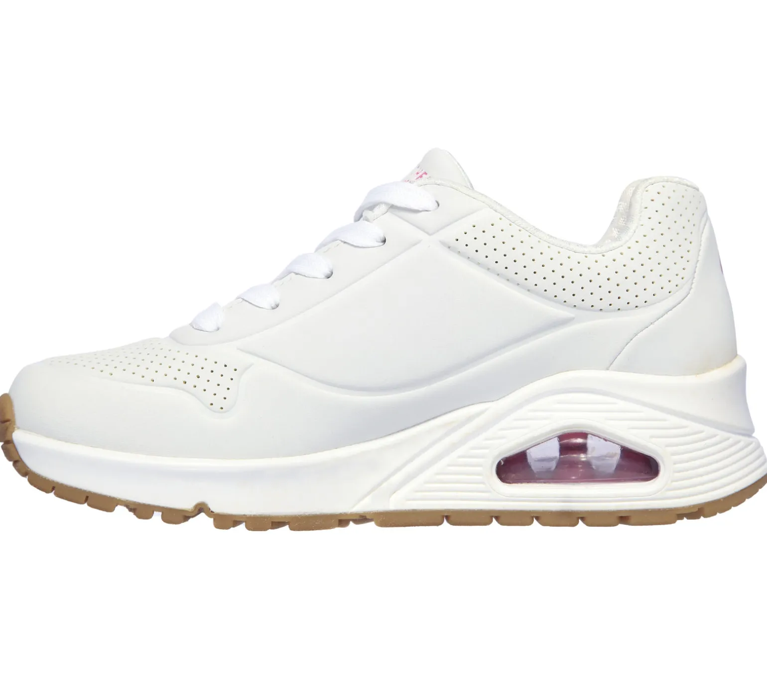 Klassischer und schnörkelloser Stil trifft auf aktualisierten Komfort in Skechers Street Uno – Stand On Air. Dieser modische Schnürsneaker verfügt über ein glattes, perforiertes Synthetik-Obermaterial mit einer Air-Cooled Memory Foam®-Innensohle und einer sichtbar luftgepolsterten Zwischensohle.