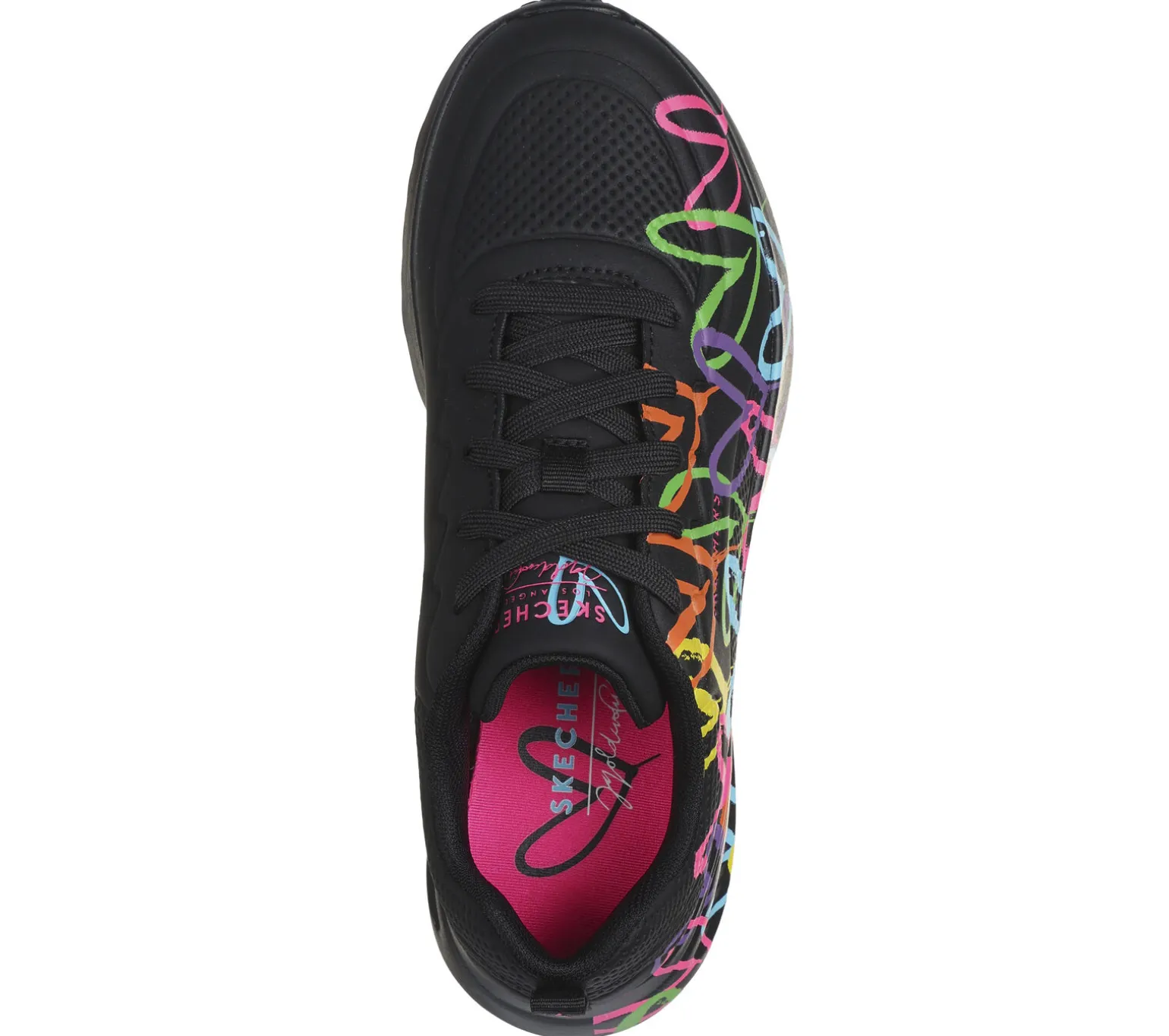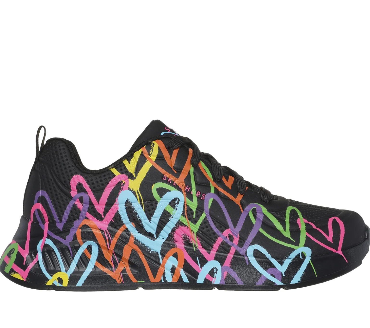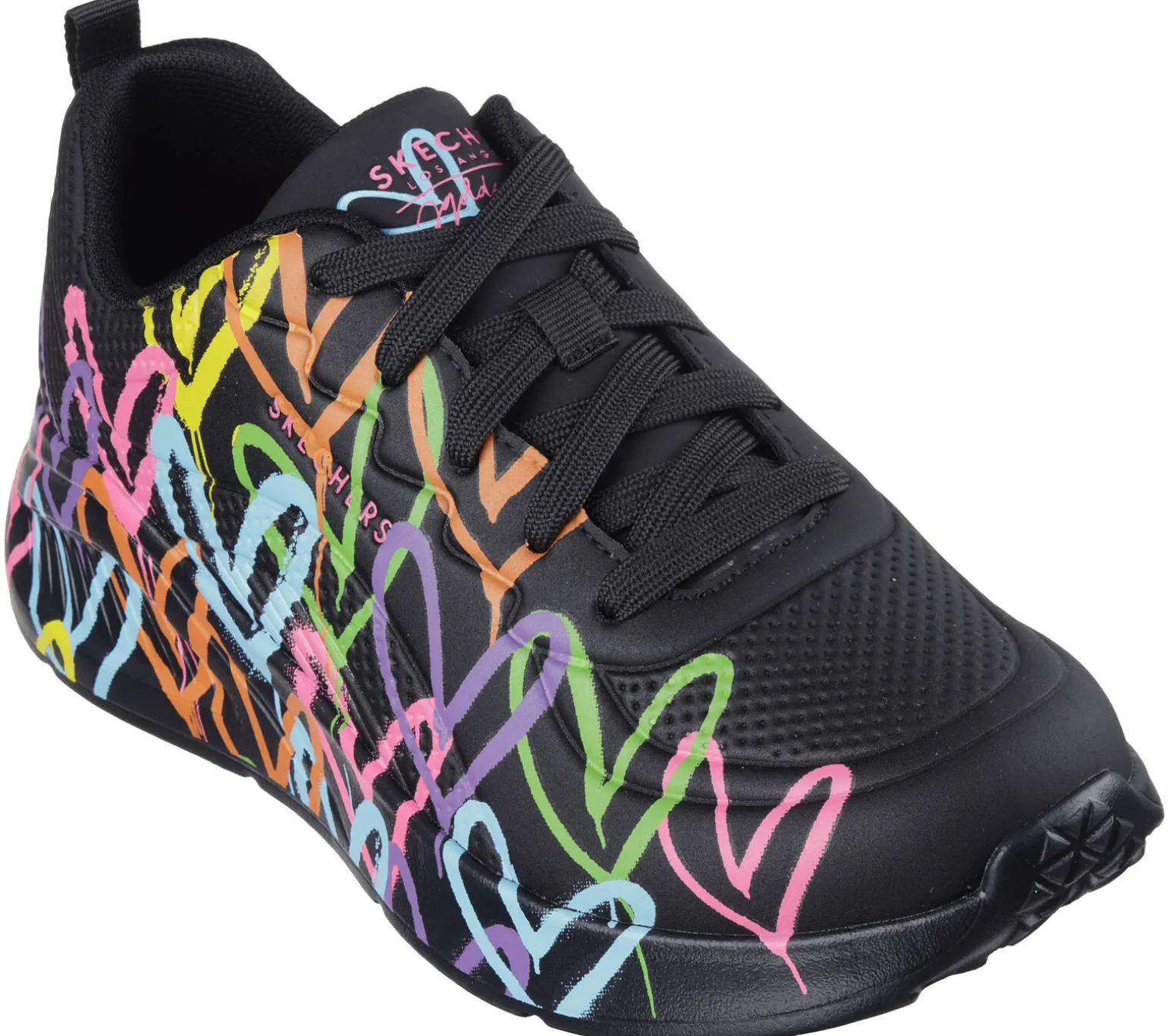 Internationally renowned muralist James Goldcrown brings his iconic #Lovewall heart designs to Skechers in this inspiring collaboration. Show your creative style with the Skechers x JGoldcrown: Skechers Street Uno Lite – Heart of Hearts. This lace-up fashion sneaker features a print of the artist’s signature heart design that extends to the outsole, synthetic durabuck and perforated trimmed upper with a Skechers Air-Cooled Memory Foam® insole, plus a platform wedge midsole.
