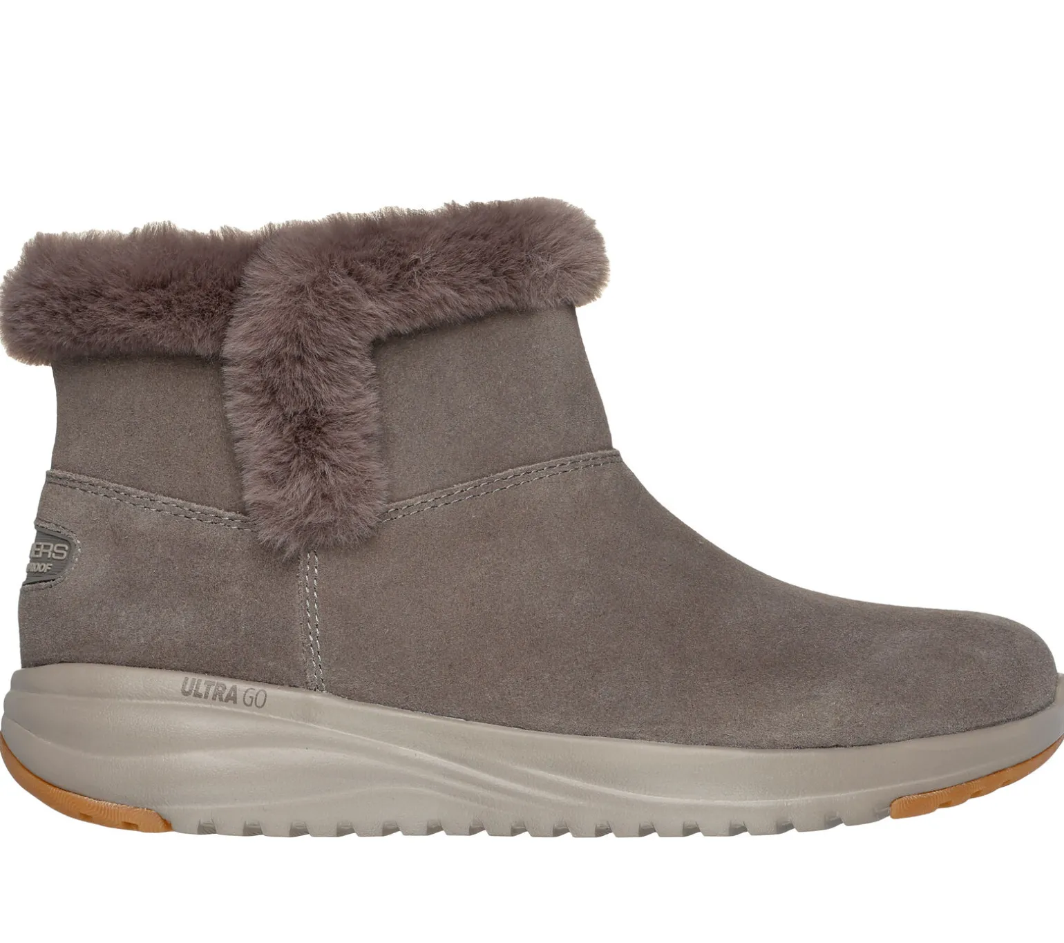 Genieße die Behaglichkeit einer klassischen Stiefelette im Shearling-Stil mit erstklassigem Skechers-Komfort im Skechers On-the-GO® Stellar – Cozy Step. Dieser wasserdichte Stiefel zum Überstreifen verfügt über ein Obermaterial aus Wildleder mit Kunstpelzfutter und -besatz, eine Air-Cooled Goga Mat-Innensohle mit hoher Rückfederung sowie eine leichte ULTRA GO®-Zwischensohle mit Dämpfung.