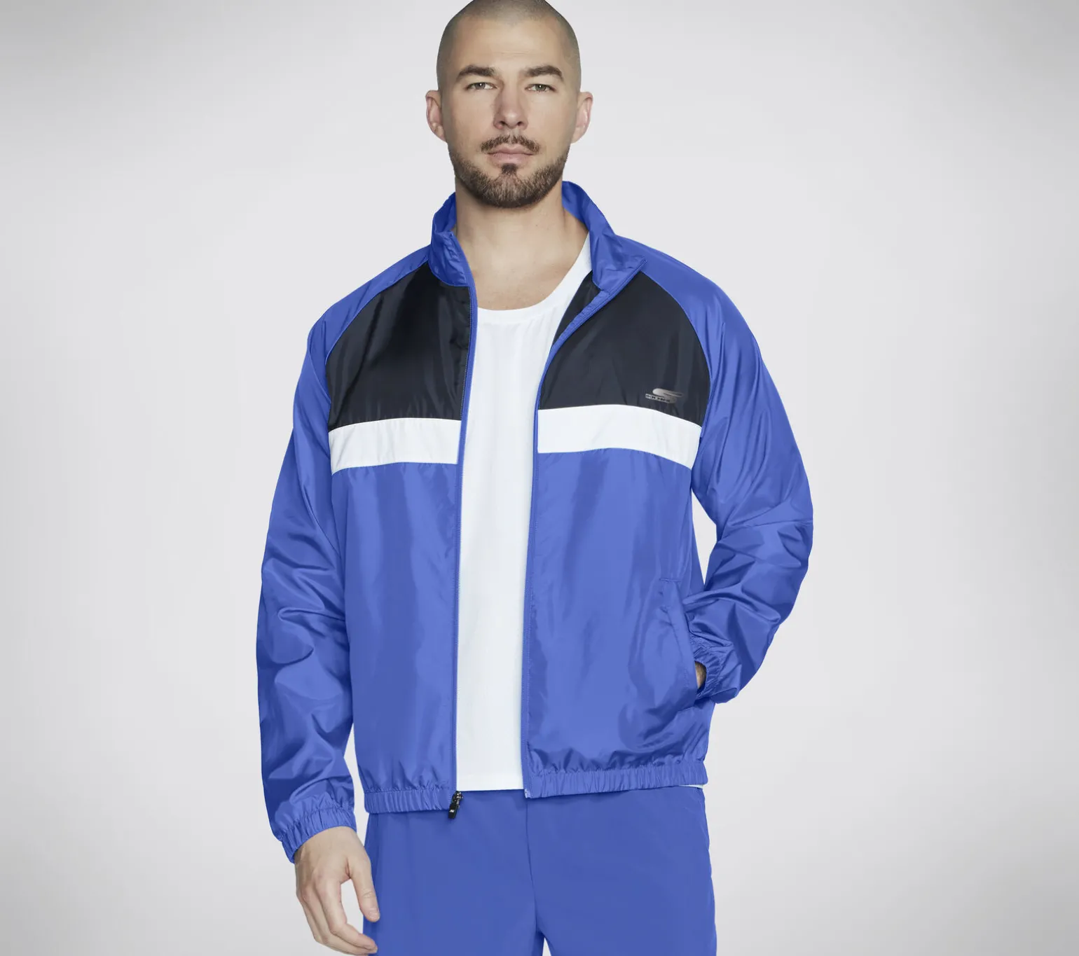 Trotze den Elementen mit sportlichem Style in der leichten Skechers Speed Elite Track Jacke. Diese Jacke mit durchgängigem Reißverschluss aus widerstandsfähigem GO SHIELD Ripstop-Gewebe verfügt über einen Stehkragen, elastische Ärmelbündchen sowie einen elastischen Bund unten, Leistentaschen vorne und ein reflektierendes Skechers Performance Logo auf der linken Brust (aus Sicht des Trägers).