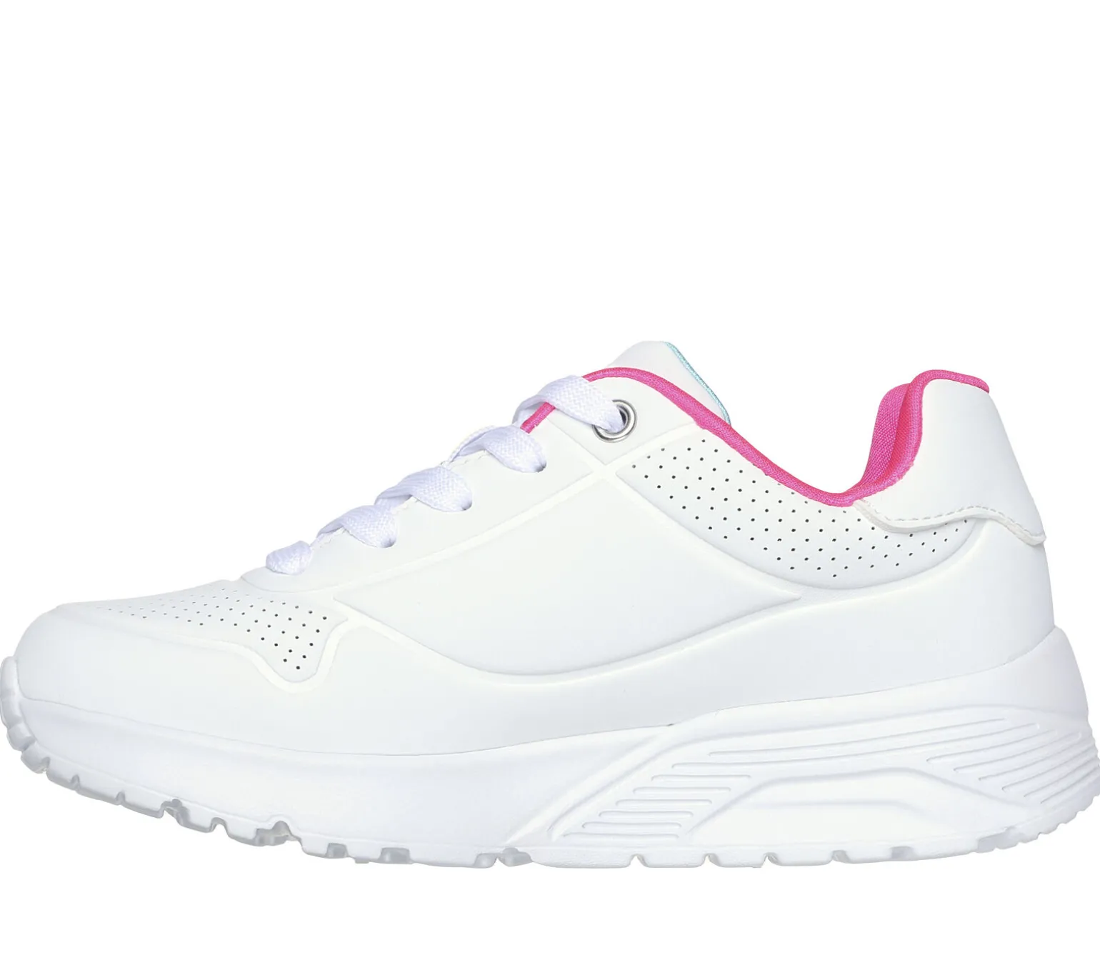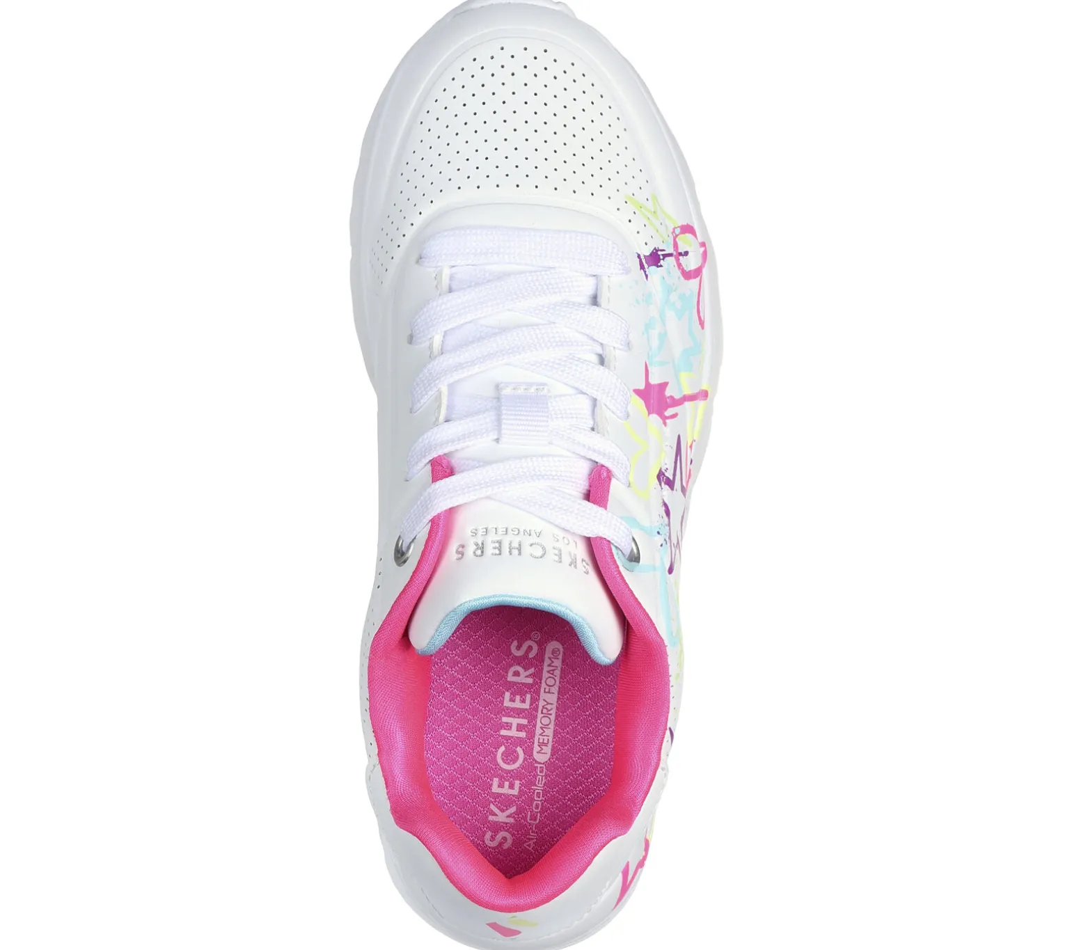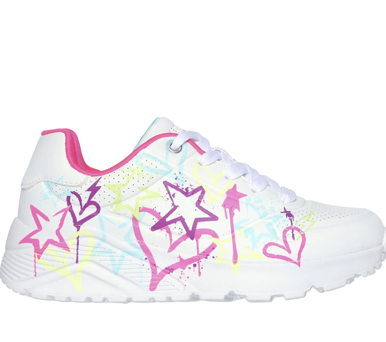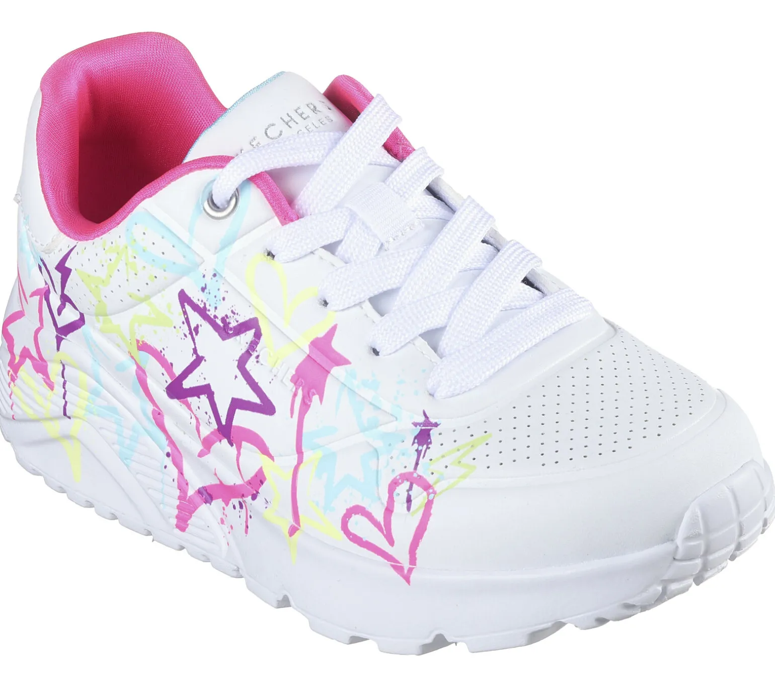 Zeige deine modische Kreativität mit dem Skechers Street Uno Lite – My Drip. Dieser modische Schnürschuh verfügt über ein Obermaterial aus synthetischem Durabuck mit einem Design aus tropfenden Sternen und Herzen, eine Skechers Air-Cooled Memory Foam Innensohle und eine keilförmige, gepolsterte Zwischensohle.
